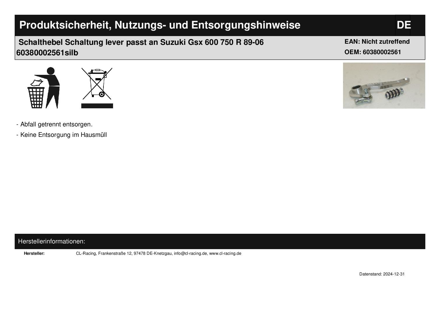 In dieser Auktion gibt es folgenden Artikel zu kaufen: Schalthebel (siehe Foto) Modell: passend für Suzuki GSX 600, 750, 1000 R Bj.: 89 - 06 Lieferumfang: siehe Foto Artikelzustand: neu aus Geschäftsauflösung, mit leichten Lagerspuren; Zustand siehe Foto Bei Unklarheiten oder Fragen bitte erst E-Mail schreiben.