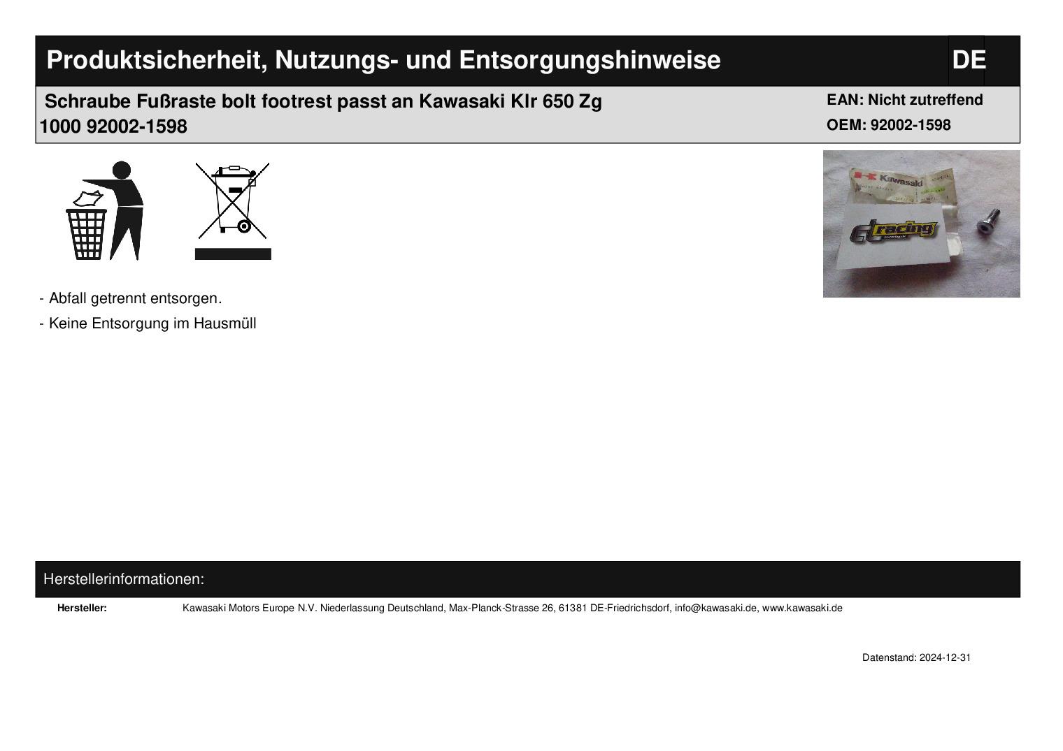 In dieser Auktion gibt es folgenden Artikel zu kaufen: Schraube für Fußraste (siehe Foto) Modell: passend für Kawasaki KLR 650 Bj.: 92 - 18