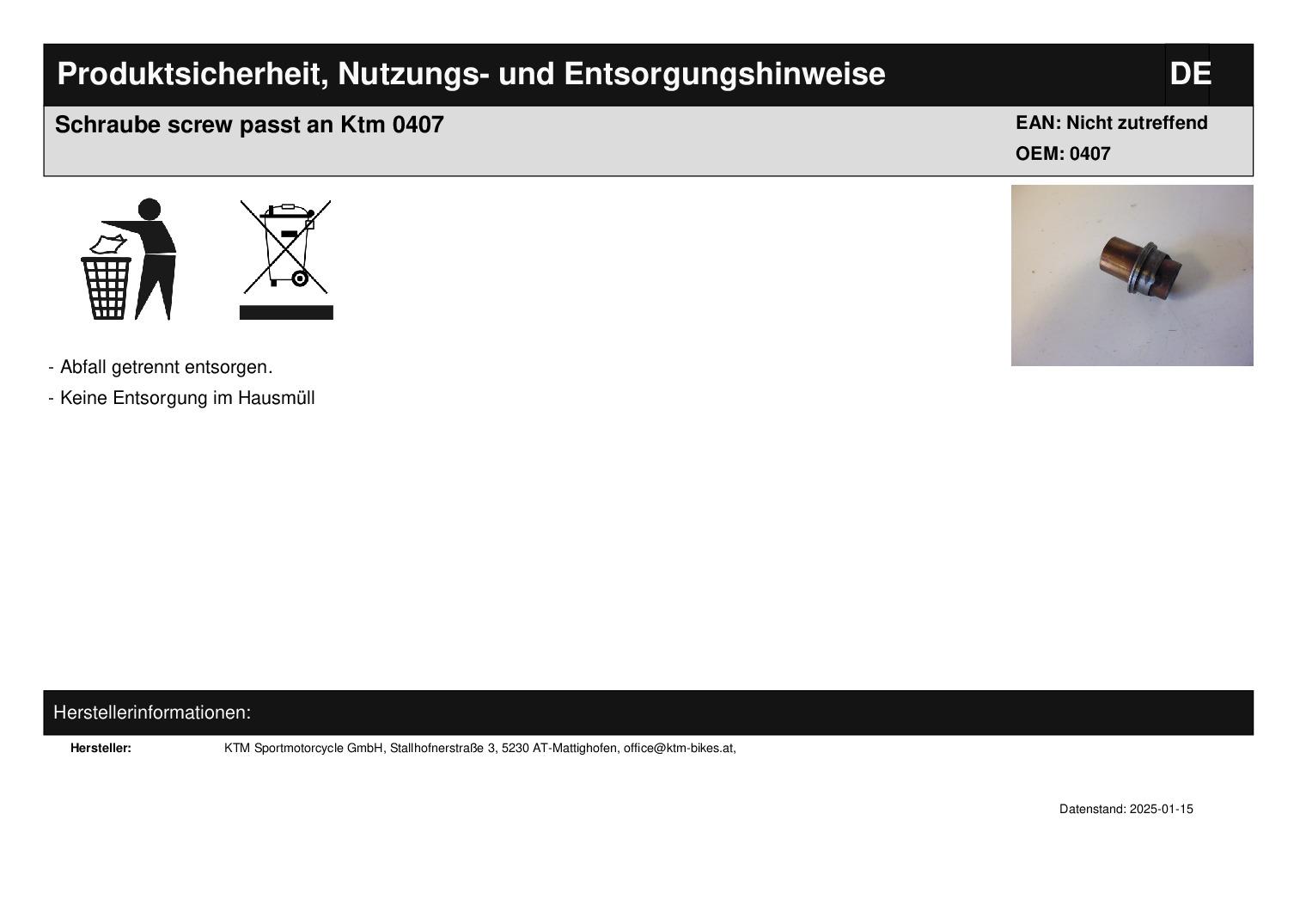 In dieser Auktion gibt es folgenden Artikel zu kaufen: Schraube (siehe Foto) Modell: passend für KTM Bj.: unbekannt Lieferumfang: siehe Foto Artikelzustand: neu aus Geschäftsauflösung, mit leichten Lagerspuren; Zustand siehe Foto Bei Unklarheiten oder Fragen bitte erst E-Mail schreiben.