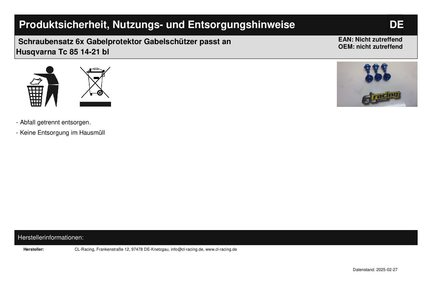 In dieser Auktion gibt es folgenden Artikel zu kaufen: Schrauben für Gabelprotektoren (siehe Foto) Modell: passend für Ktm Sx 50 Bj.: 2012 - 2021 Sx 65 Bj.: 2003 - 2025 Sx 85 Bj.: 2003 - 2025 Sx, Sx-f, Exc, Exc-f 125 - 530 ccm Modelle Bj.: 2000 - 2025 Freeride 250, 350 Bj.: 2014 - 2017 Lc4 690 Enduro / R Bj.: 2008 - 2018 Smc 690 Bj.: 2008 - 2024 Smc-r 690 Bj.: 2008 - 2024 Enduro R Bj.: 2008 - 2024 Xc, Xc-f 125 - 530 ccm Modelle Bj.: 2000 - 2025 Xc-w, Xcf-w 125 - 530 ccm Modelle Bj.: 2000 - 2025 passend für Husqvarna: Te 50, 65 Bj.: 2017 - 2021 Tc 85 Bj.: 2014 - 2021 Tc, Fc, Te, Fe, Tx, Tx, Fe-i Bj.: 2014 - 2021 701 Enduro Bj.: 2016 - 2021 passend für Yamaha Yz 65 Bj.: 2018 - 2022 Yz 85 Bj.: 2019 - 2022 Yz 125 Bj.: 2008 - 2022 Yz 250 Bj.: 2008 - 2022 Yz 250f Bj.: 2008 - 2022 Yz 450f Bj.: 2008 - 2022 Yz 125x Bj.: 2017 - 2022 Yz 250x Bj.: 2016 - 2022 Yz 250fx Bj.: 2015 - 2022 Yz 450fx B.: 2016 - 2022 Wr 250f Bj.: 2020 - 2022 Wr 450f Bj.: 2019 - 2022 Lieferumfang: 6 Stück Artikelzustand: neu Es handelt sich hierbei um kein Originalteil! Bei Unklarheiten oder Fragen bitte erst E-Mail schreiben.