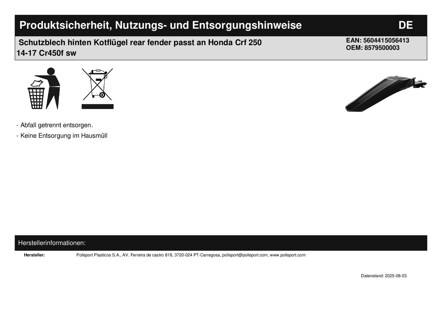 In dieser Auktion gibt es folgenden Artikel zu kaufen: Schutzblech (siehe Foto) Fahrzeug: passend für Honda CRF 250 R Bj.: 14 - 17 (4-Takt) CRF 450 R Bj.: 13 - 16 (4-Takt) Lieferumfang: siehe Foto Artikelzustand: neu aus Geschäftsauflösung, mit minimalen Lagerspuren; Zustand siehe Foto Bei Unklarheiten oder Fragen bitte erst E-Mail schreiben.
