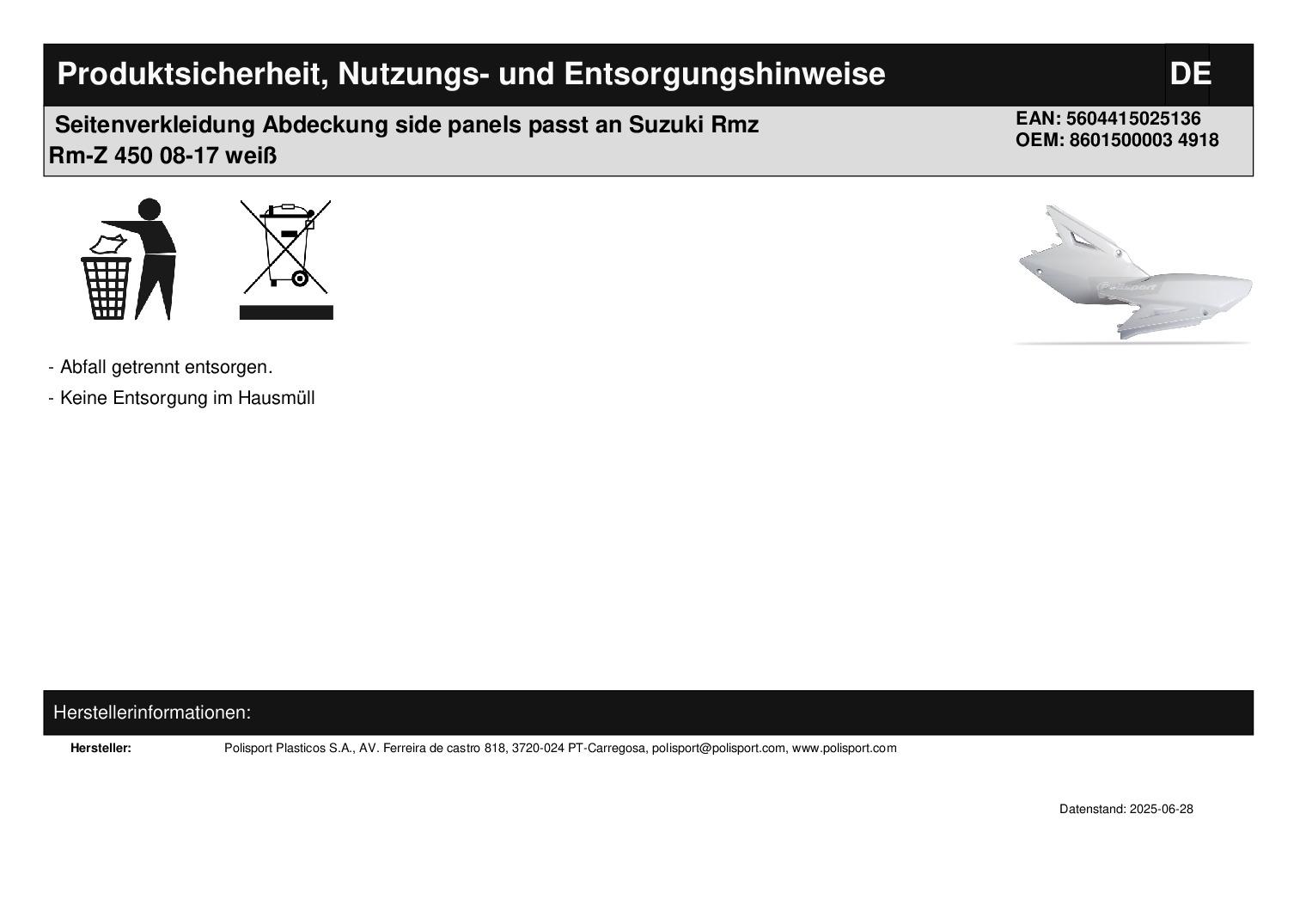 In dieser Auktion gibt es folgenden Artikel zu kaufen: Seitenverkleidung (siehe Foto) Modell: passend für Suzuki RMZ 450 Bj.: 08 - 17 Lieferumfang: links + rechts Artikelzustand: neu aus Geschäftsauflösung, mit minimalen Lagerspuren; Zustand siehe Foto Bei Unklarheiten oder Fragen bitte erst E-Mail schreiben.