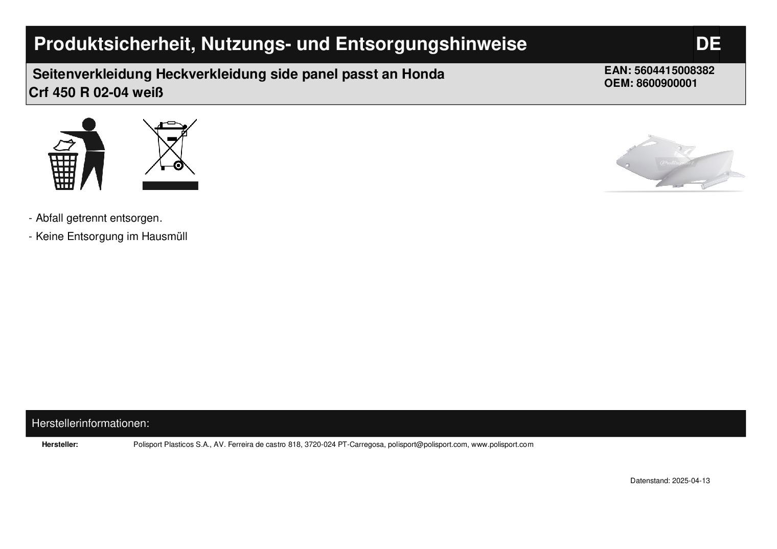 In dieser Auktion gibt es folgenden Artikel zu kaufen: Seitenverkleidung (siehe Foto) Fahrzeug: passend für Honda CRF 450 R Bj.: 02 - 04 (4-Takt) Lieferumfang: siehe Foto Artikelzustand: neu Bei Unklarheiten oder Fragen bitte erst E-Mail schreiben.