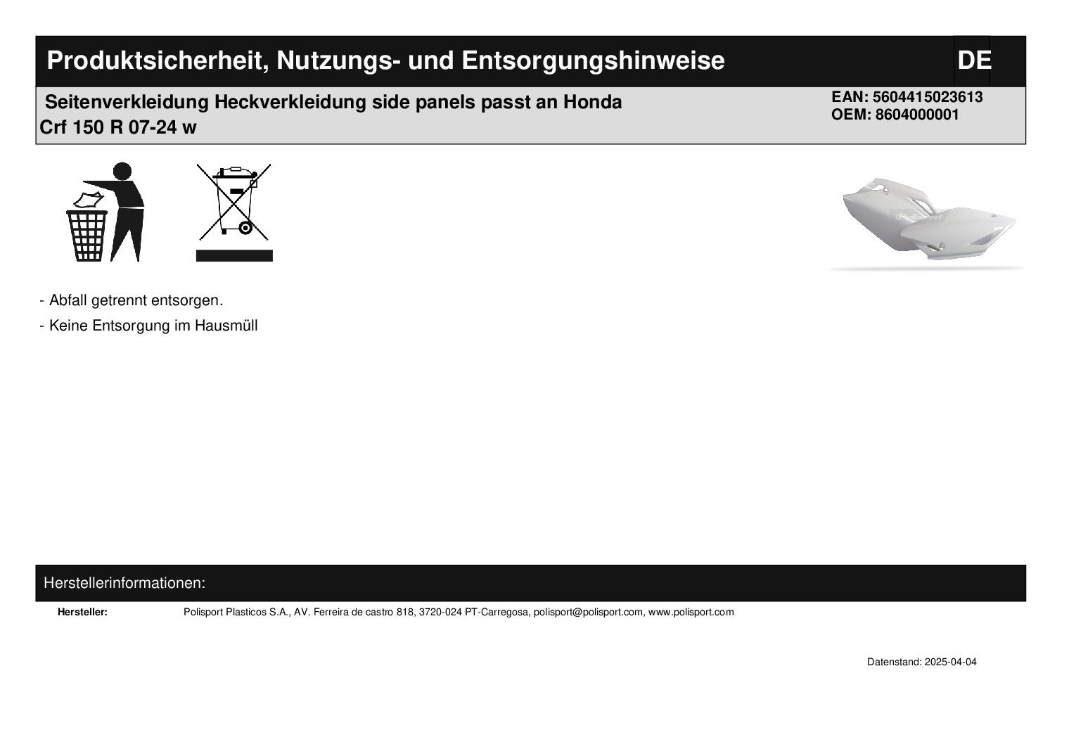 In dieser Auktion gibt es folgenden Artikel zu kaufen: Seitenverkleidung (siehe Foto) Fahrzeug: passend für Honda Crf 150R (4-Takt) Bj.: 2007 - 2024 Lieferumfang: links + rechts Artikelzustand: neu aus Geschäftsauflösung, mit leichten Lagerspuren; Zustand siehe Foto