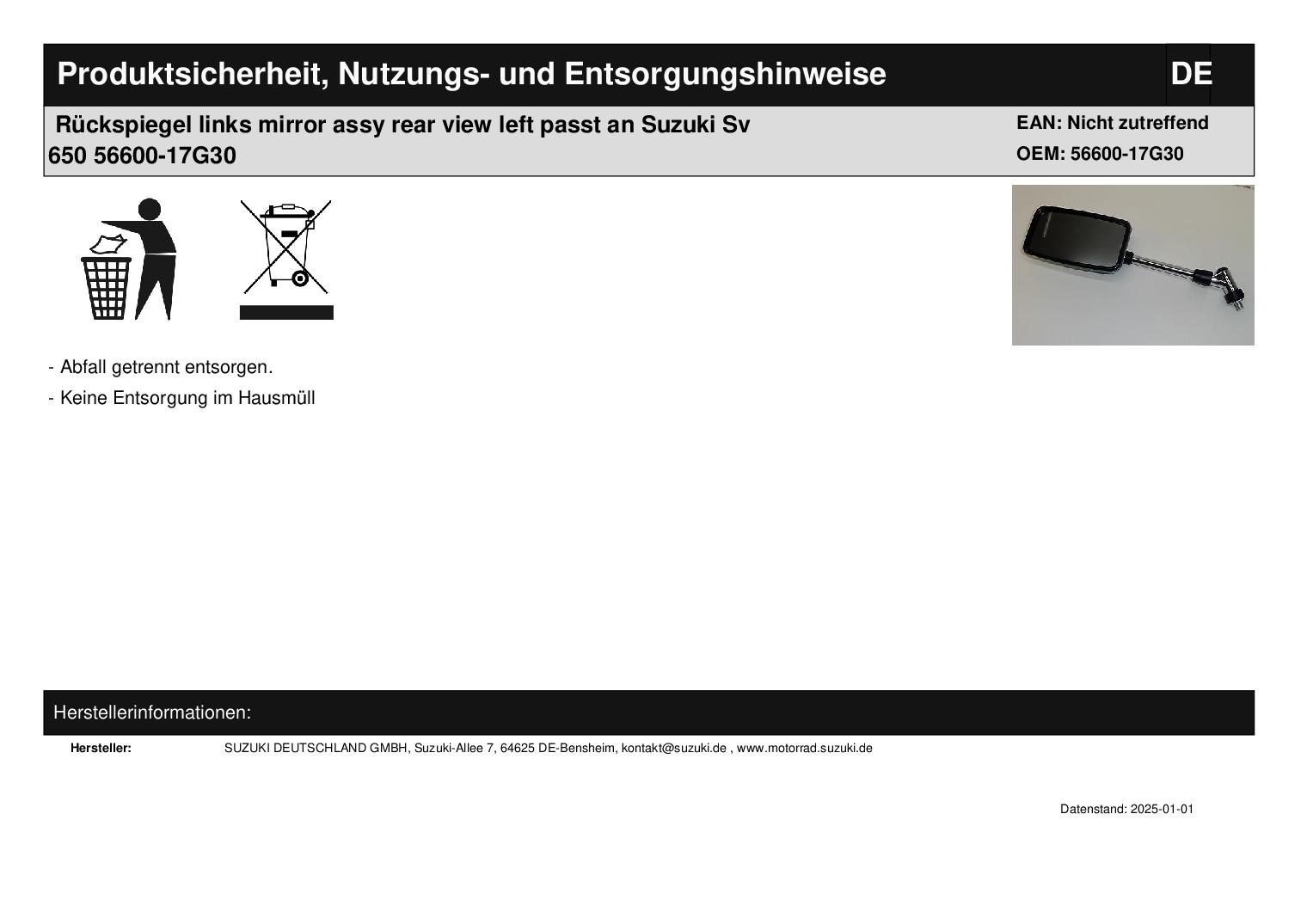 Titel: Rückspiegel links mirror assy rear view left passt an Suzuki Sv 650 56600-17G30
