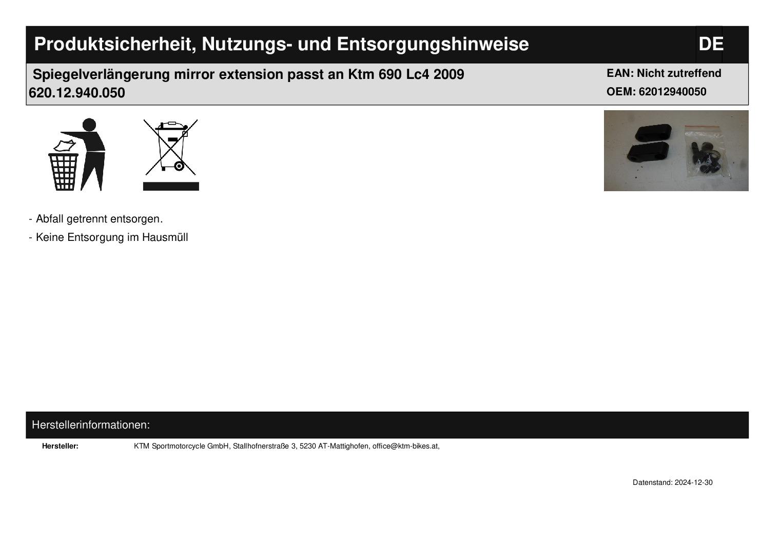 In dieser Auktion gibt es folgenden Artikel zu kaufen: Spiegelverlängerung (siehe Foto) Fahrzeug: passend für Ktm 690 Lc4 Bj.: 2009 Lieferumfang: siehe Foto Artikelzustand: neu aus Geschäftsauflösung, mit leichten Lagerspuren; Zustand siehe Foto Bei Unklarheiten oder Fragen bitte erst Email schreiben.
