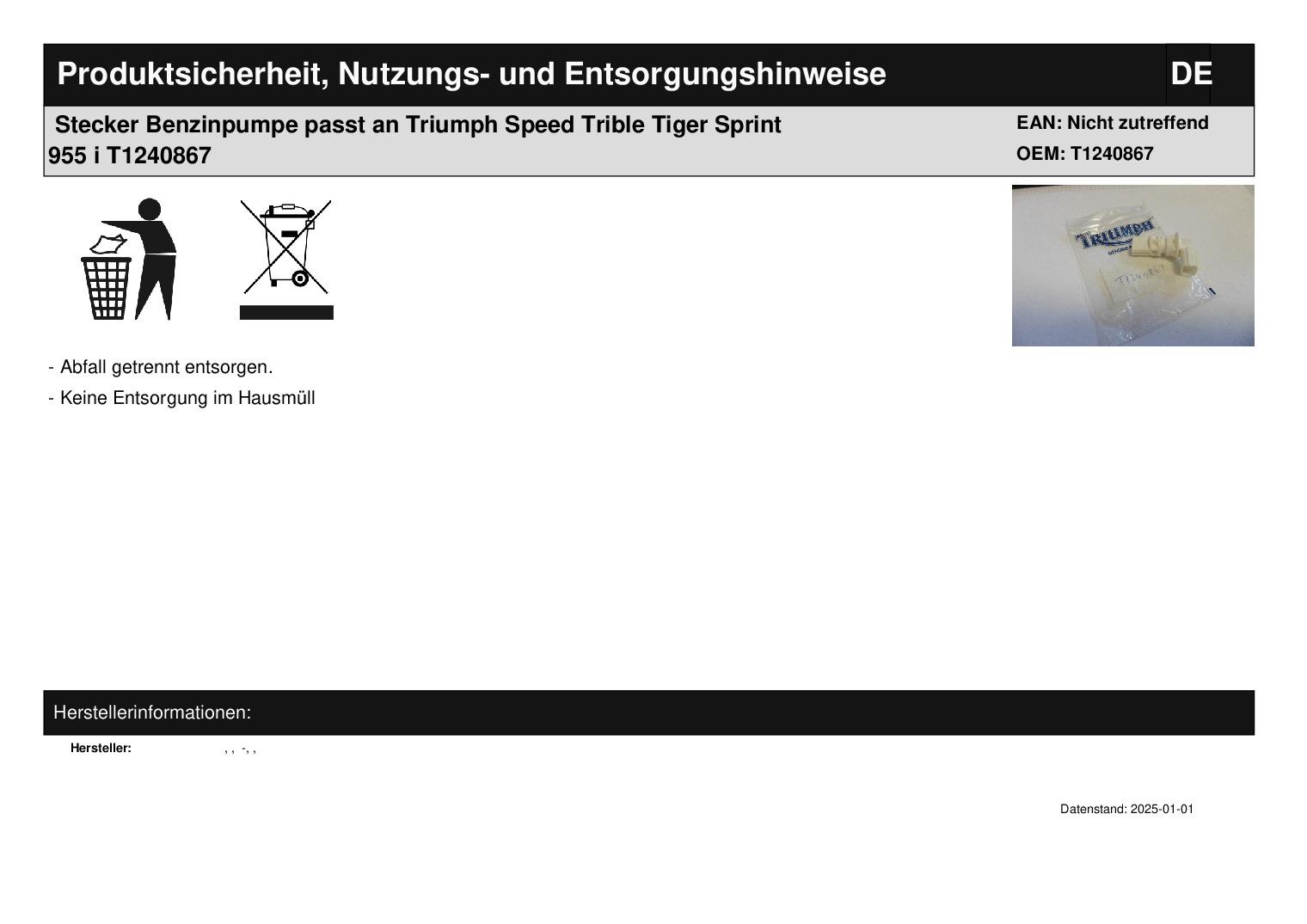 In dieser Auktion gibt es folgenden Artikel zu kaufen: Stecker (siehe Foto) Modell: passend für Triumph Speed Triple Bj.: unbekannt Daytona 955 i Bj.: unbekannt Speed St Bj.: unbekannt Sprint RS Bj.: unbekannt Tiger 955 i Bj.: unbekannt Lieferumfang: siehe Foto Artikelzustand: neu aus Geschäftsauflösung, mit minimalen Lagerspuren; Zustand siehe Foto Bei Unklarheiten oder Fragen bitte erst E-Mail schreiben.