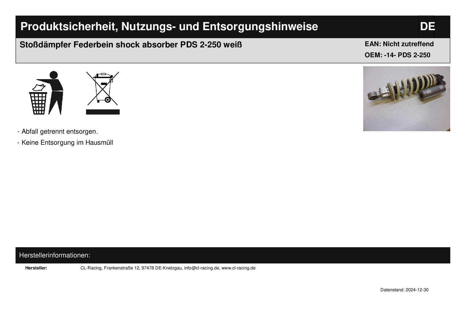 In dieser Auktion gibt es folgenden Artikel zu kaufen: Stoßdämpfer (siehe Foto) Modell: unbekannt Bj.: unbekannt Details: PDS 2-250 steht auf dem Stoßdämper Bitte vor dem Kauf vergleichen! Lieferumfang: siehe Foto Artikelzustand: normale Gebrauchsspuren vorhanden; wird als defekt verkauft, da nicht sicher ist, ob der Stoßdämpfer dicht ist; Zustand siehe Foto Bei Unklarheiten oder Fragen bitte erst E-Mail schreiben.