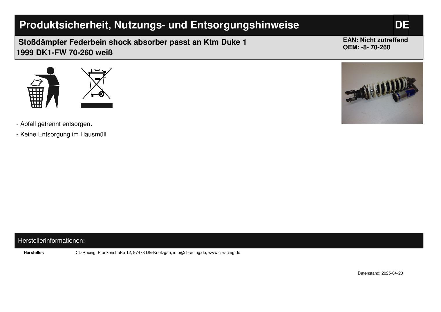 In dieser Auktion gibt es folgenden Artikel zu kaufen: Stoßdämpfer (siehe Foto) Modell: passend für Ktm Duke 1 Bj.: 99 Details: 70-260 steht auf dem Stoßdämper Bitte vor dem Kauf vergleichen! Lieferumfang: siehe Foto Artikelzustand: normale Gebrauchsspuren vorhanden; wird als defekt verkauft, da nicht sicher ist, ob der Stoßdämpfer dicht ist; Zustand siehe Foto Es handelt sich hierbei um kein Originalteil Bei Unklarheiten oder Fragen bitte erst E-Mail schreiben.