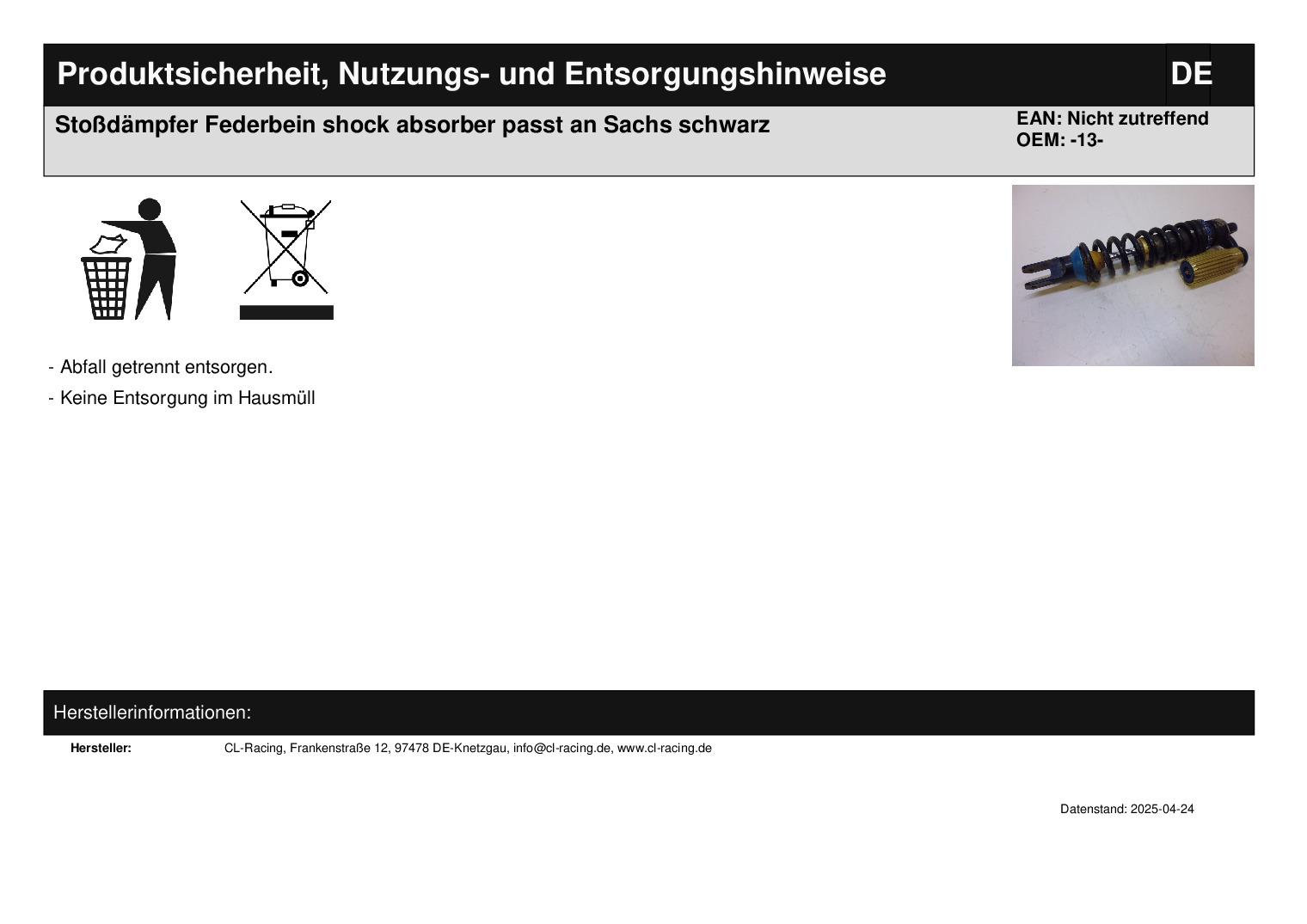 In dieser Auktion gibt es folgenden Artikel zu kaufen: Stoßdämpfer (siehe Foto) Modell: unbekannt Bj.: unbekannt Details: Sachs (steht auf dem Stoßdämpfer) Lieferumfang: siehe Foto Artikelzustand: normale Gebrauchsspuren vorhanden; wird als defekt verkauft, da Stoßdämpfer nicht dicht ist; Zustand siehe Foto! Bei Unklarheiten oder Fragen bitte erst E-Mail schreiben.