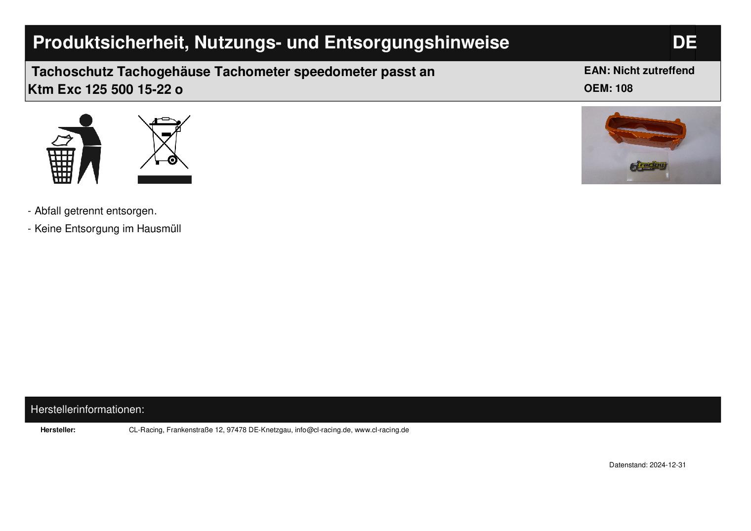 In dieser Auktion gibt es folgenden Artikel zu kaufen: Schutz für Tacho (siehe Foto) Modell: passend für Ktm Exc 125, 150, 250, 300, 350, 450, 500 Bj.: 2015 - 2022 (2- und 4-Takt) technische Daten: - eloxiertes Aluminiumgehäuse (2-teilig); wird über dem originalen Tacho montiert - Es ist keine Nacharbeit nötig. - Material: Aluminium eloxiert Lieferumfang: Gehäuse inkl. Stellschraube Artikelzustand: neu Es handelt sich hierbei um kein Originalteil Bei Unklarheiten oder Fragen bitte erst E-Mail schreiben.