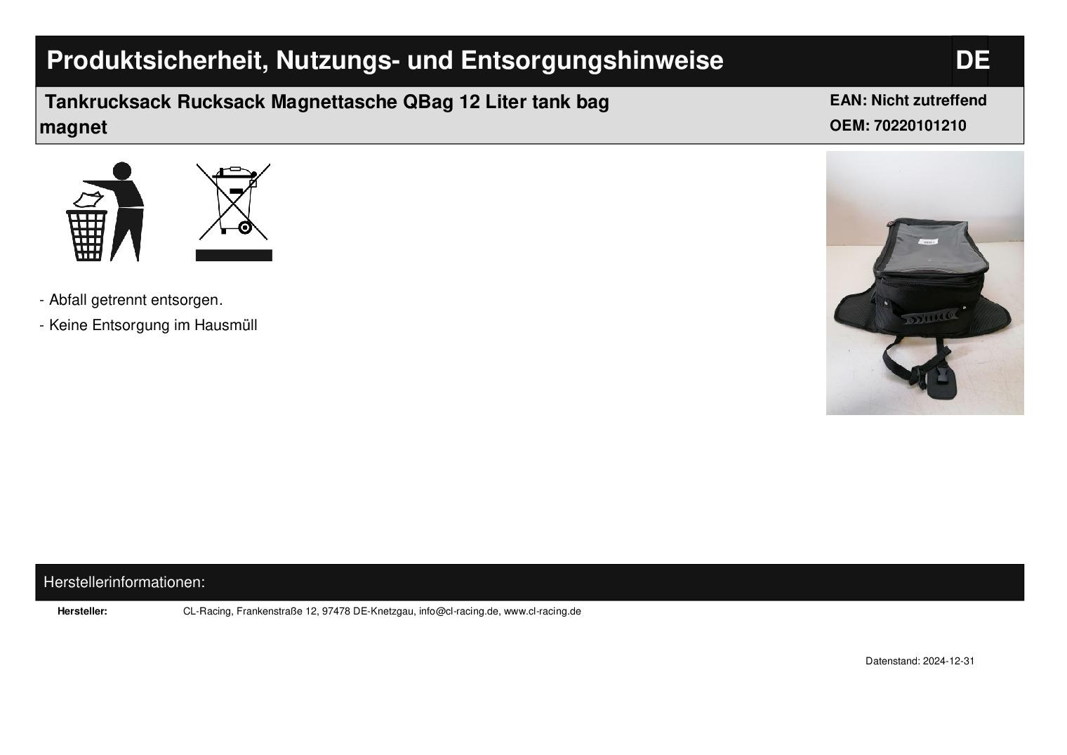 In dieser Auktion gibt es folgenden Artikel zu kaufen: Tankrucksack (siehe Foto) Hersteller: QBag Modell: universal Details: - passend für viele Enduros, Sportler- und Tourenmaschinen - großes Hauptfach - die Zipper des Hauptfaches können per Druckknopf gegeneinander gesichert werden - große Einschubtasche innen im Deckel des Hauptfachs - das große Kartenfach ist seitlich von außen zugänglich - zwei seitliche Aufsatztaschen - Aufsatztasche zum Fahrer - der Tankrucksack kann über einen Reißverschluss von der Bodenplatte abgenommen werden - in den Boden des Tankrucksacks sind Rucksack-Gurte integriert - hochreißfestes 840D-Polyamid mit PVC-Beschichtung - 7 haftstarke Magnete und der zusätzliche Sicherungsgurt zum Lenkkopf sorgen auf fast jedem Tank aus Stahl für sicheren Halt - bei Tankformen, bei denen alle Magnete vollflächigen Kontakt haben, kann die Verwendung des Lenkkopfriemens aus Komfortgründen entfallen - bei zerklüfteten Tankformen oder Modellen, bei denen Magnete nur im hinteren Bereich haften, weil vorne eine Kunststoffabdeckung dies verhindert, kann der Lenkkopfriemen die sichere Verwendung erst ermöglichen - generell bitte immer auf den ersten Fahrten oder bei neuer Beladung zunächst vorsichtig die Geschwindigkeit steigern Material: 100% Polyamid Maße ca.: außen: 40 x 32 x 21 cm Bodenplatte: 40 x 48 cm 12 Liter Stauraum Hauptfach innen: 34 x 25 x 20 cm Einschubtasche im Deckel innen: 25 x 24 cm Kartenfach innen: 29 x 23,5 cm Sichtfenster: 29 x 21,5 cm seitliche Aufsatztaschen innen: 24 x 3 x 11,5 cm Aufsatztasche zum Fahrer innen: 3 x 19 x 11 cm Breite Schulterpolster der Rucksackriemen: 4 cm Länge maximal der Rucksackriemen: 56 cm Kartenfach in Bodenplatte innen: 29 x 25,5 cm Sichtfenster in Bodenplatte: 28 x 25,5 cm Einschubtasche zum Fahrer hin innen: 19 x 21 cm Breite Tragegriff: 3 cm Lenkkopfgurt: 46 x 1,8 cm G ewicht: 1490 g Lieferumfang: siehe Foto Artikelzustand: neu aus Geschäftsauflösung; leichte Gebrauchsspuren vorhanden; ein Zipper ist am Reißverschluss kaputt; lässt sich noch Schließen; Tasche wird jedoch aus diesem Grund ausdrücklich als defekt verkauft!!! Zustand siehe Foto Bei Unklarheiten oder Fragen bitte erst E-Mail schreiben.