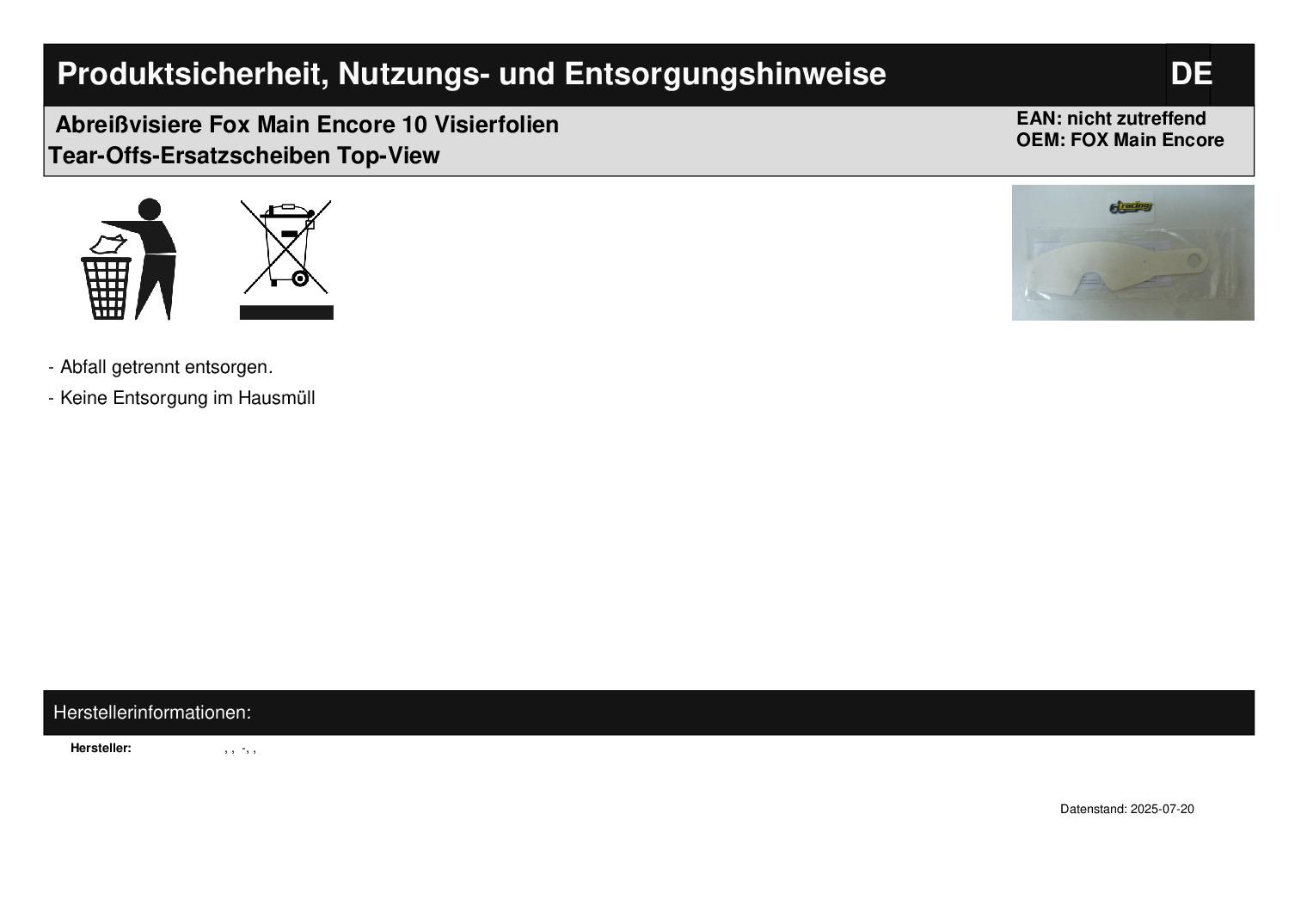 Titel: Abreißvisiere Fox Main Encore 10 Visierfolien Tear-Offs-Ersatzscheiben Top-View