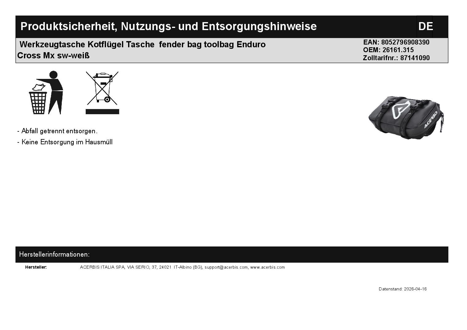 In dieser Auktion gibt es folgenden Artikel zu kaufen: Werkzeugtasche für Schutzblech hinten (siehe Foto) Artikelbeschreibung: - kompakte Werkzeugtasche - Inhalt 2 Liter - Schnellverschluss-System mit 4 Metallhaken für den vorderen Kotflügel - Verschluss mit verstellbaren Gurten - Gummiboden für besseren Halt - Innentasche mit breitem Werkzeugfächer - transparente Innentasche für Kleinteile - gedrucktes Logo auf der Vorderseite Abmaße: Grundplatte ca. 25 x 14 cm Höhe ca. 6 - 7 cm Material: 95 % Polyester, 5 % andere Fasern Lieferumfang: Toolbag ohne Werkzeug! Artikelzustand: neu Bei Unklarheiten oder Fragen bitte erst E-Mail schreiben.