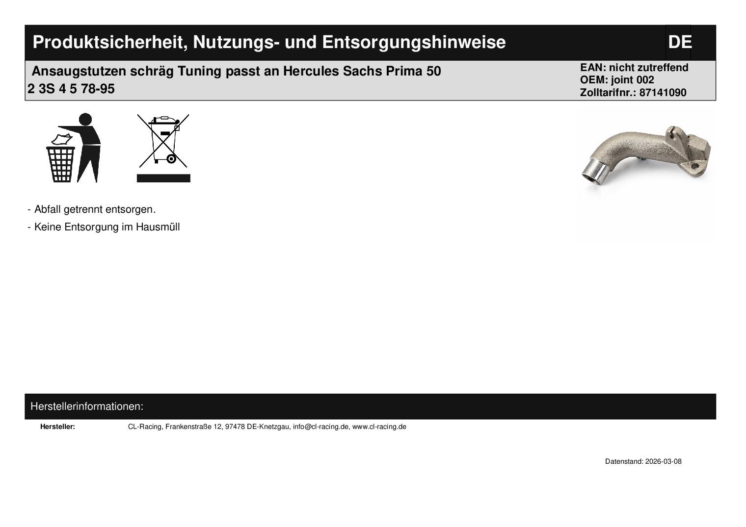 In dieser Auktion gibt es folgenden Artikel zu kaufen: Tuning-Ansaugstutzen mit schräger Anschlussfläche (siehe Foto) Modell: passend für Hercules Prima 50 2 Bj.: 88 - 98 50 2N Bj.: 78 - 87 50 2S Bj.: 82 - 94 50 3 Bj.: 94 50 3S 82 - 93 50 4 Bj.: 75 - 78 50 4N Bj.: 78 - 85 50 4S Bj.: 78 - 85 50 4SL Bj: 81 50 5 78 - 95 50 5N Bj.: 78 - 85 50 5S Bj.: 78 - 95 50 5SL Bj.: 81 passend für Sachs mit Motor Typ 504 und 505! Details: - Ansaugstutzen hat einen schräger Zylinderanschluss - Falls ein gerader Anschluss benötigt wird, finden Sie diesen bei uns im Ebay-Shop. - Vergaseranschlussdurchmesser = Ø 20 mm - Innendurchmesser am Vergaseranschluss = Ø14 mm Lieferumfang: siehe Foto Artikelzustand: neu
