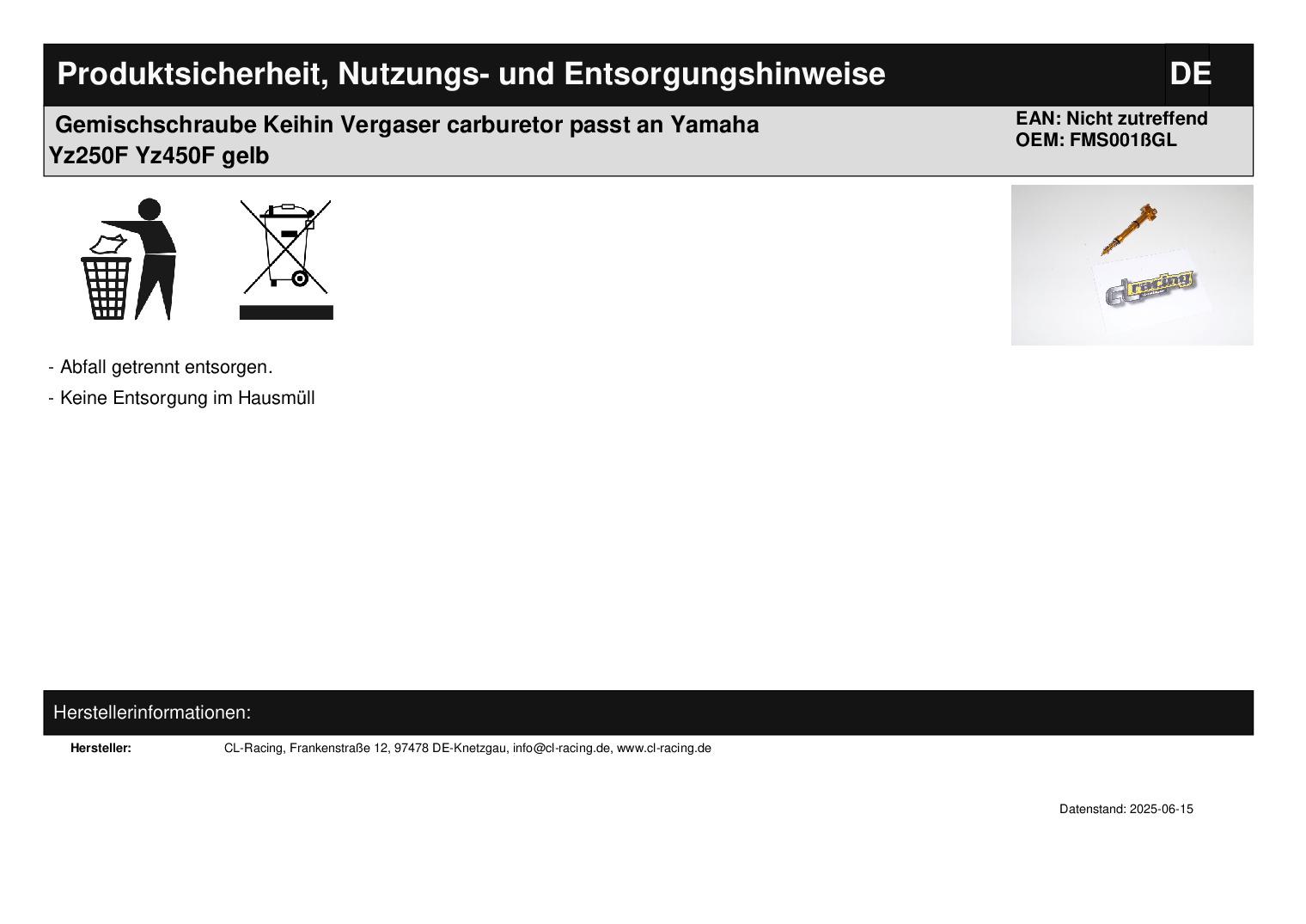 Titel: Gemischschraube Keihin Vergaser carburetor passt an Yamaha Yz250F Yz450F gelb