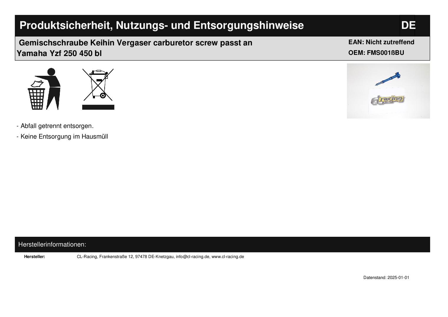 In dieser Auktion gibt es folgenden Artikel zu kaufen: Gemischschraube für Keihin FCR-Vergaser (siehe Foto) Modell: passend für Honda CR-F 250, 450 (4-Takt) passend für Kawasaki KX-F 250, 450 (4-Takt) passend für Ktm EXC-F, SX-F 250, 400, 450, 520, 525, 530 (4-Takt) passend für Yamaha YZ-F, WR-F 250, 426, 450 (4-Takt) Lieferumfang: 1 Stück Weitere Farben auf Anfrage! Artikelzustand: neu Bei Unklarheiten oder Fragen bitte erst E-Mail schreiben.