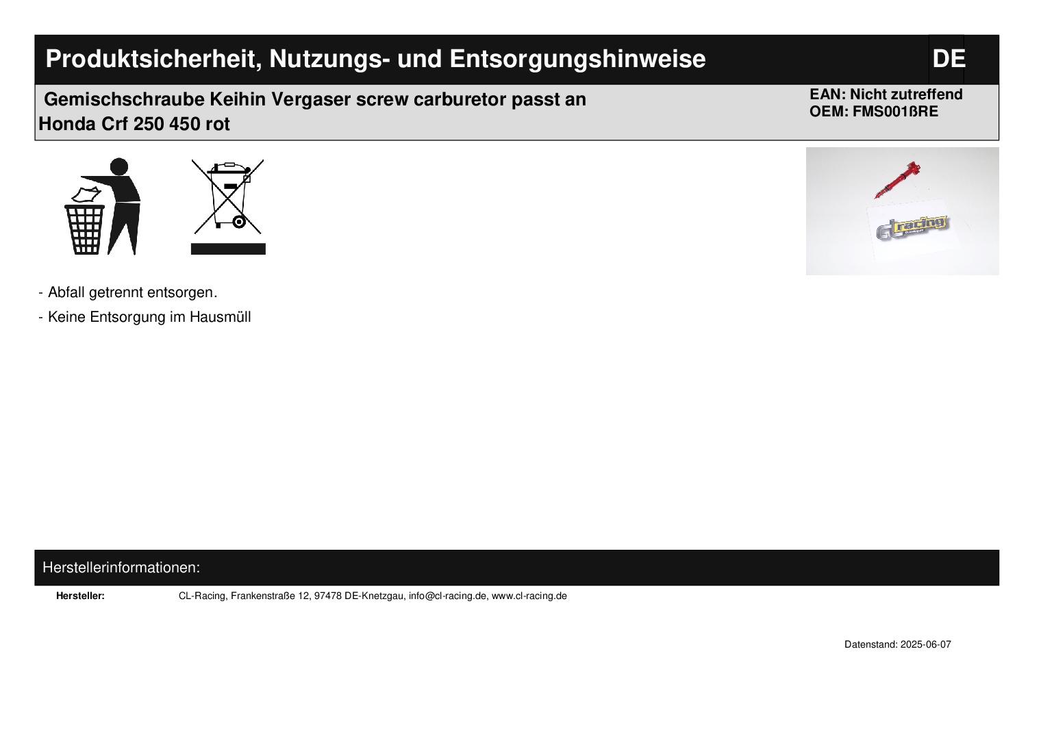 • Gemischschraube Keihin Vergaser screw carburetor passt an Honda Crf 250 450 rot