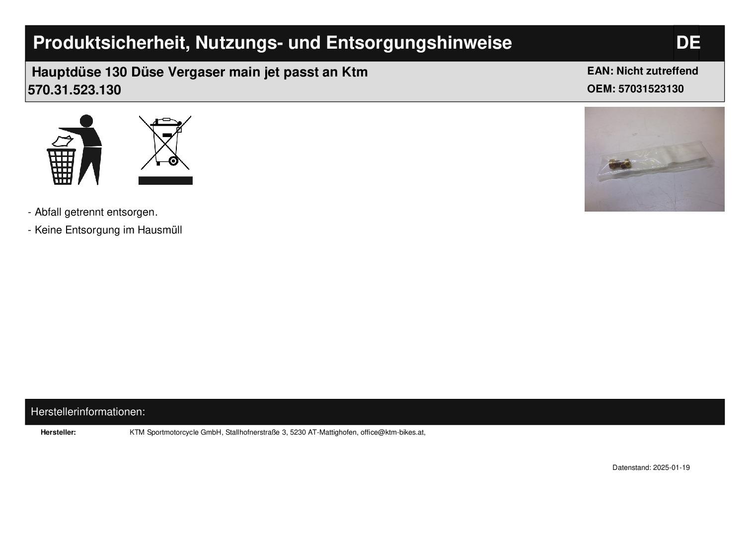 In dieser Auktion gibt es folgenden Artikel zu kaufen: Hauptdüse, 1 Stück (siehe Foto) Modell: passend KTM Bj.: unbekannt Lieferumfang: 1 Stück Artikelzustand: neu aus Geschäftsauflösung, mit minimalen Lagerspuren; Zustand siehe Foto Bei Unklarheiten oder Fragen bitte erst E-Mail schreiben.