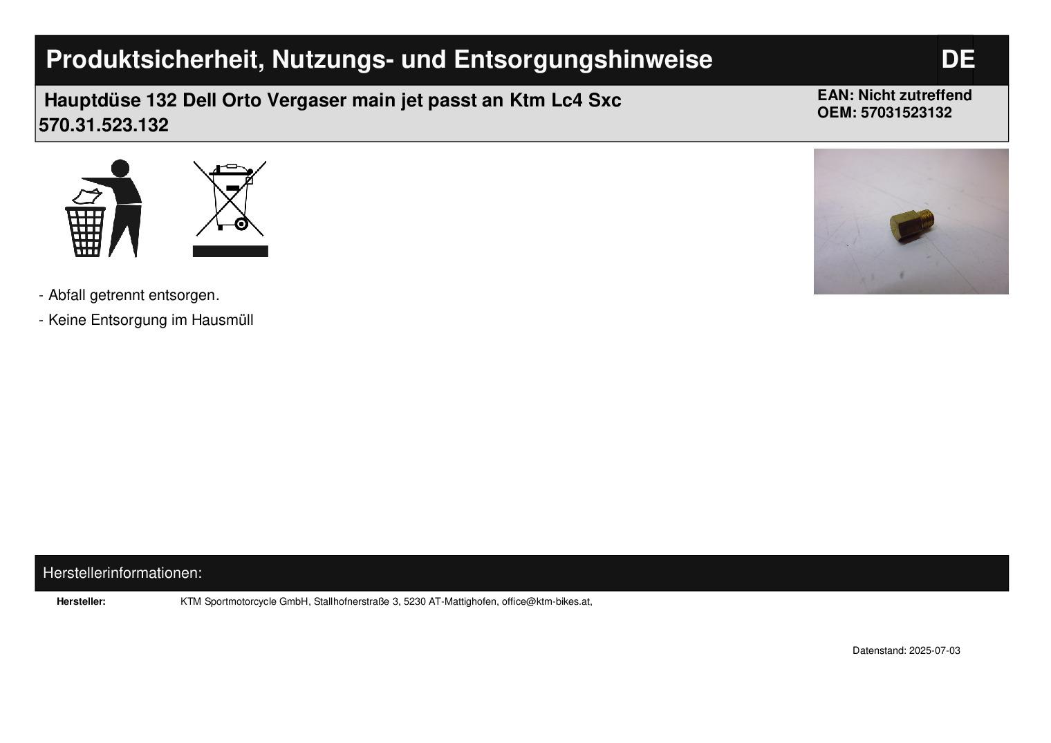 Titel: Hauptdüse 132 Dell Orto Vergaser main jet passt an Ktm Lc4 Sxc 570.31.523.132