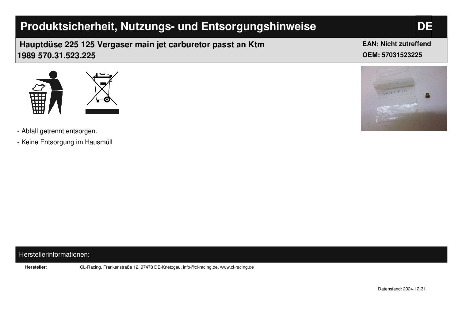 In dieser Auktion gibt es folgenden Artikel zu kaufen: Hauptdüse 225 125 (siehe Foto) Modell: passend für Ktm Bj.: 89 Lieferumfang: 1 Stück Artikelzustand: neu aus Geschäftsauflösung, mit minimalen Lagerspuren; Zustand siehe Foto Es handelt sich hierbei um kein Originalteil Bei Unklarheiten oder Fragen bitte erst E-Mail schreiben.
