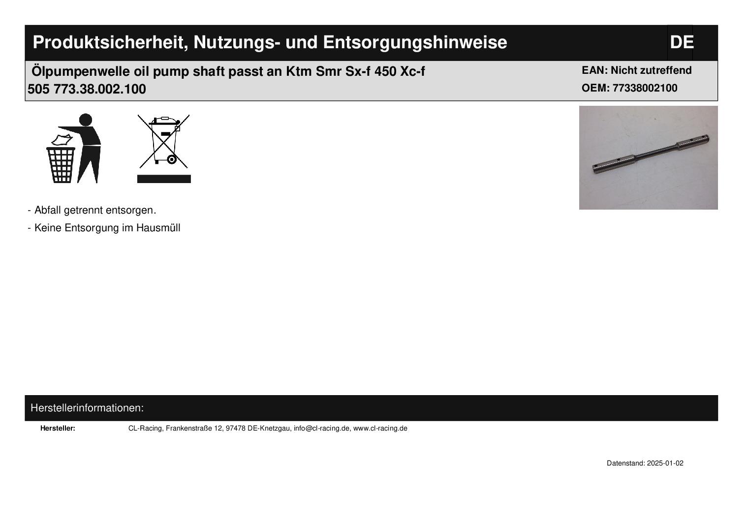 In dieser Auktion gibt es folgenden Artikel zu kaufen: Ölpumpenwelle (siehe Foto) Modell: passend für Ktm SMR, SXF 450 Bj.: 09 - 12 XCF 450 Bj.: 09 XCF 505 Bj.: 09 Rally Factory Replica Europe 450 Bj.: 11 - 14 Lieferumfang: 1 Stück Artikelzustand: neu aus Geschäftsauflösung, mit leichten Lagerspuren; Zustand siehe Foto Es handelt sich hierbei um kein Originalteil Bei Unklarheiten oder Fragen bitte erst E-Mail schreiben.