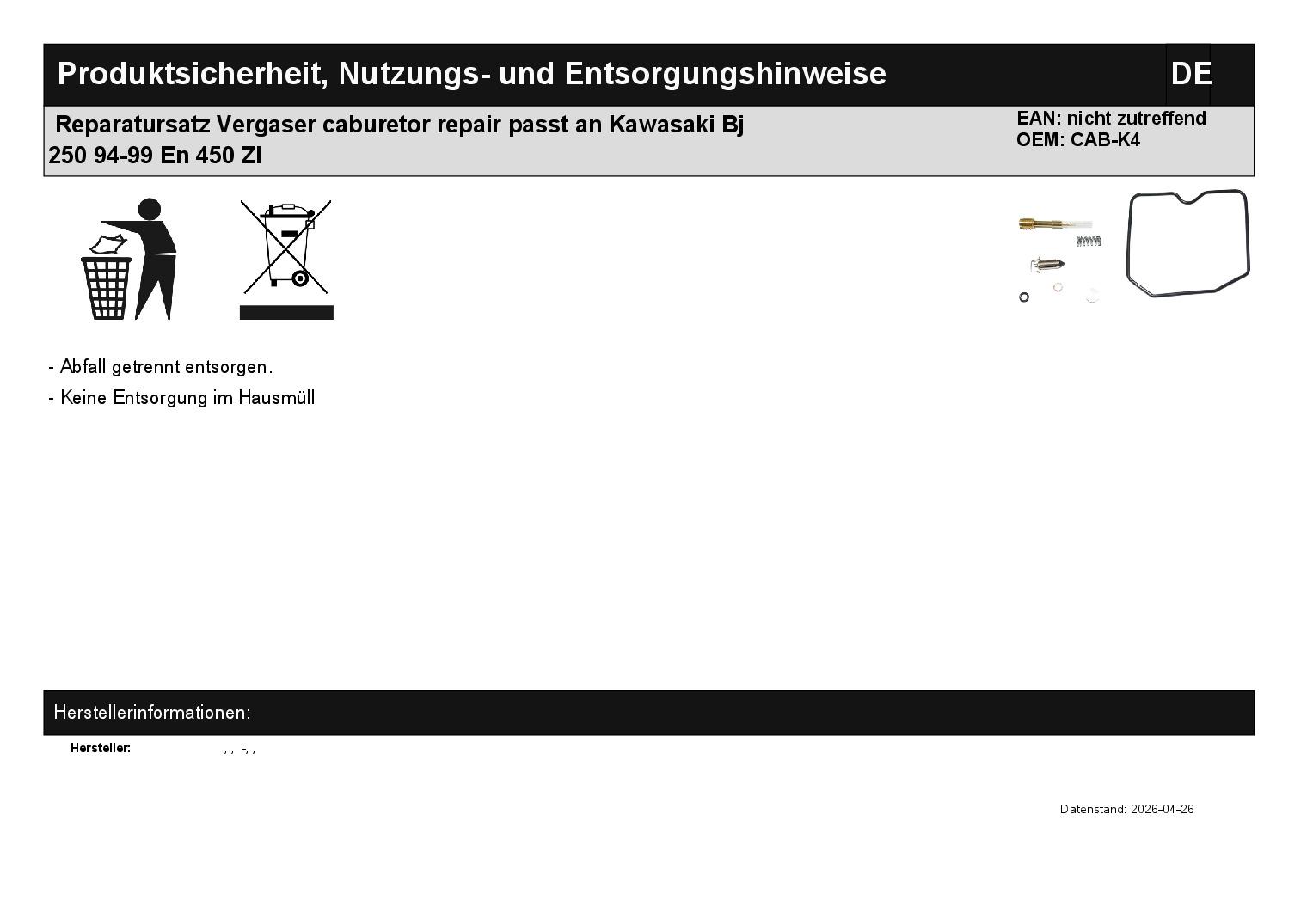 In dieser Auktion gibt es folgenden Artikel zu kaufen: Reparatursatz (ähnlich Foto) Modell: passend für Kawasaki BJ 250 Bj.: 1994 - 1999 EL 250 Bj.: 1988 - 1995 EL 252 Bj.: 1996 - 2003 EN 450 Bj.: 1985 - 1989 EN 500 Bj.: 1990 - 1995 GPX 600 Bj.: 1988 - 1996 GPX 750 Bj.: 1987 - 1988 GPZ 1000 Bj.: 1986 - 1987 GPZ 400 Bj.: 1985 GPZ 500 Bj.: 1987 - 1993 GPZ 550 Bj.: 1987 - 1989 GPZ 600 Bj.: 1985 - 1990 GPZ 750 Bj.: 1985 GPZ 900 Bj.: 1984 - 1992 GT 550 Bj.: 1987 - 1990 GTR 1000 Bj.: 1986 - 1995 KFX 250 Bj.: 2000 - 2004 KLE 500 Bj.: 1991 - 2007 KLR 250 Bj.: 1984 - 1992 KLX 250 Bj.: 1993 - 1997 ZL 1000 Bj.: 1987 - 1988 ZL 600 Bj.: 1986 - 1988 ZL 900 Bj.: 1985 - 1986 ZR 1100 Bj.: 1992 - 1997 ZR 550 Bj.: 1991 - 1999 ZR 750 Bj.: 1994 - 1999 Lieferumfang: siehe Foto Artikelzustand: neu Hierbei handelt es sich um kein Originalteil! Bei Unklarheiten oder Fragen bitte erst E-Mail schreiben.
