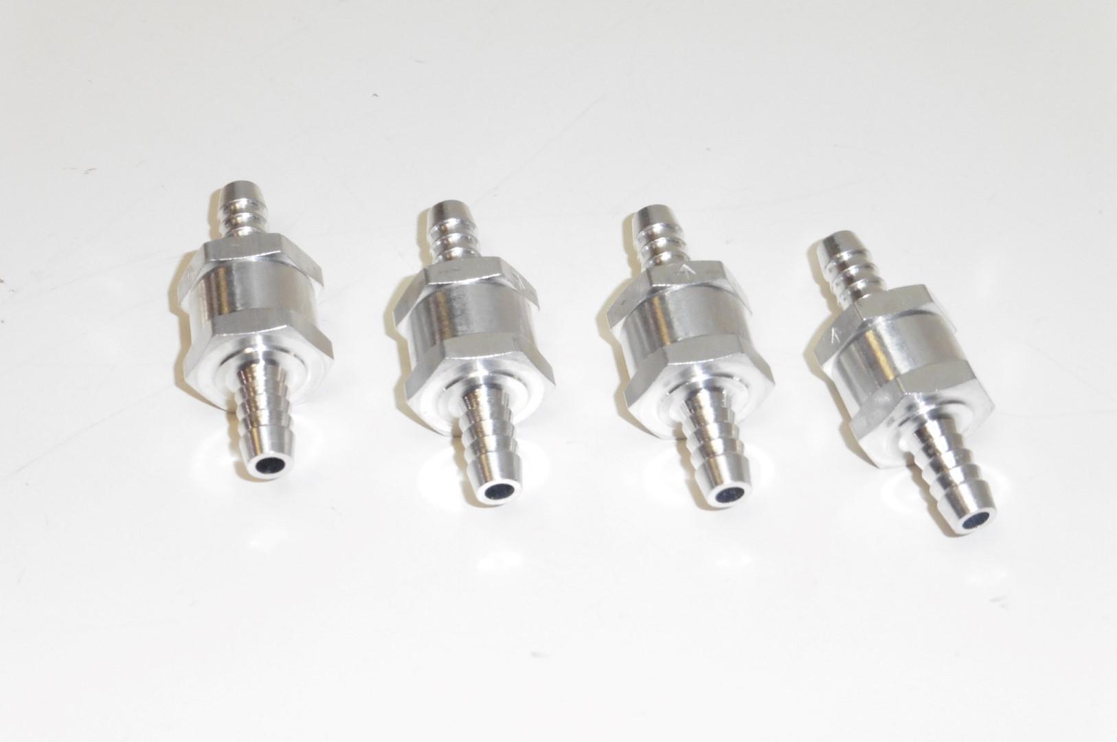 Rückschlagventile (siehe Foto) Artikelbeschreibung: verhindert den Rücklauf und Rückschlag von Flüssigkeiten, Fetten, Ölen, Benzin oder Gas Material: Aluminium Maße: Gesamtlänge: 60 mm Anschlusslänge: ca. 18 mm Anschlussdurchmesser: Ø 8 mm Arbeitsbereich: 0 - 5 bar Öffnungsdruck: 0,2 bar Lieferumfang: 4 Stück Artikelzustand: neu Bei Unklarheiten oder Fragen bitte erst E-Mail schreiben.