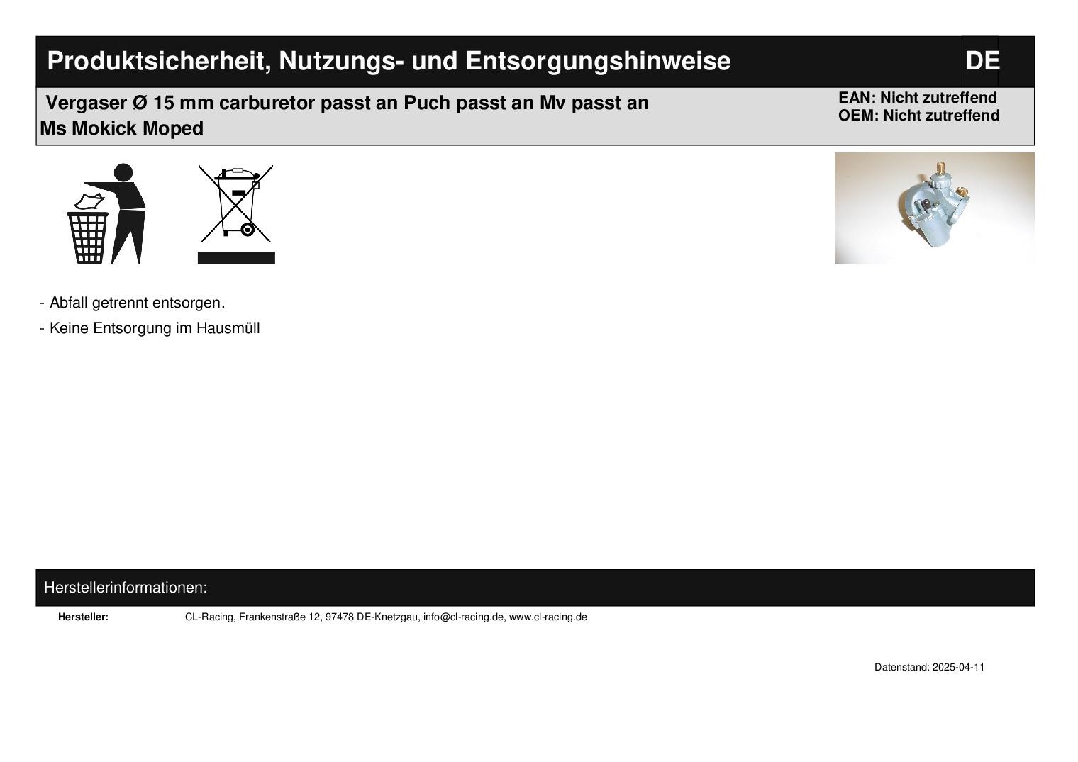 Titel: Vergaser Ø 15 mm carburetor passt an Puch passt an Mv passt an Ms Mokick Moped