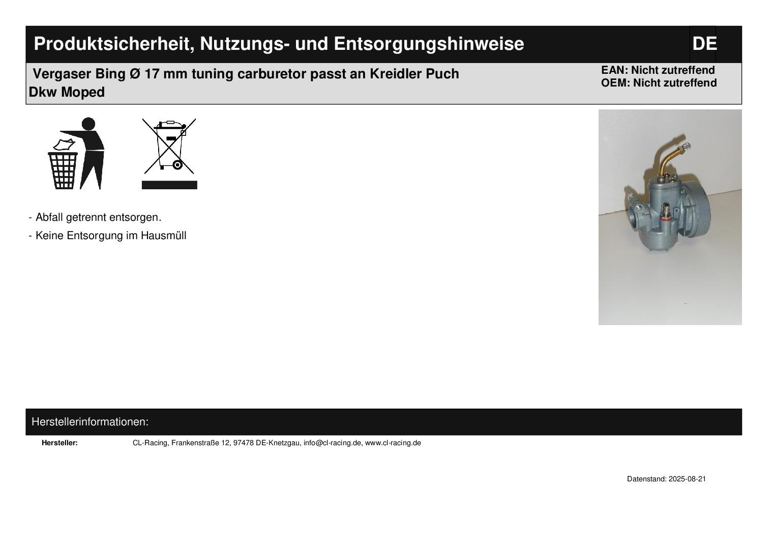In dieser Auktion gibt es folgenden Artikel zu kaufen: Bing-Nachbau-Vergaser Ø 17 mm mit Kaltstartautomatik (siehe Foto) Modell: passend für viele Sachs-, Hercules-, Kreidler-, Zündapp-, Puch-, DKW-Mopeds Abmaße: Anschlussdurchmesser am Ansaugstutzen: 23 mm (Bohrung) Durchmesser am Luftfilter: 60 mm Bitte Abmaße vergleichen! Lieferumfang: 1 Stück Artikelzustand: neu Bei Unklarheiten oder Fragen bitte erst E-Mail schreiben.