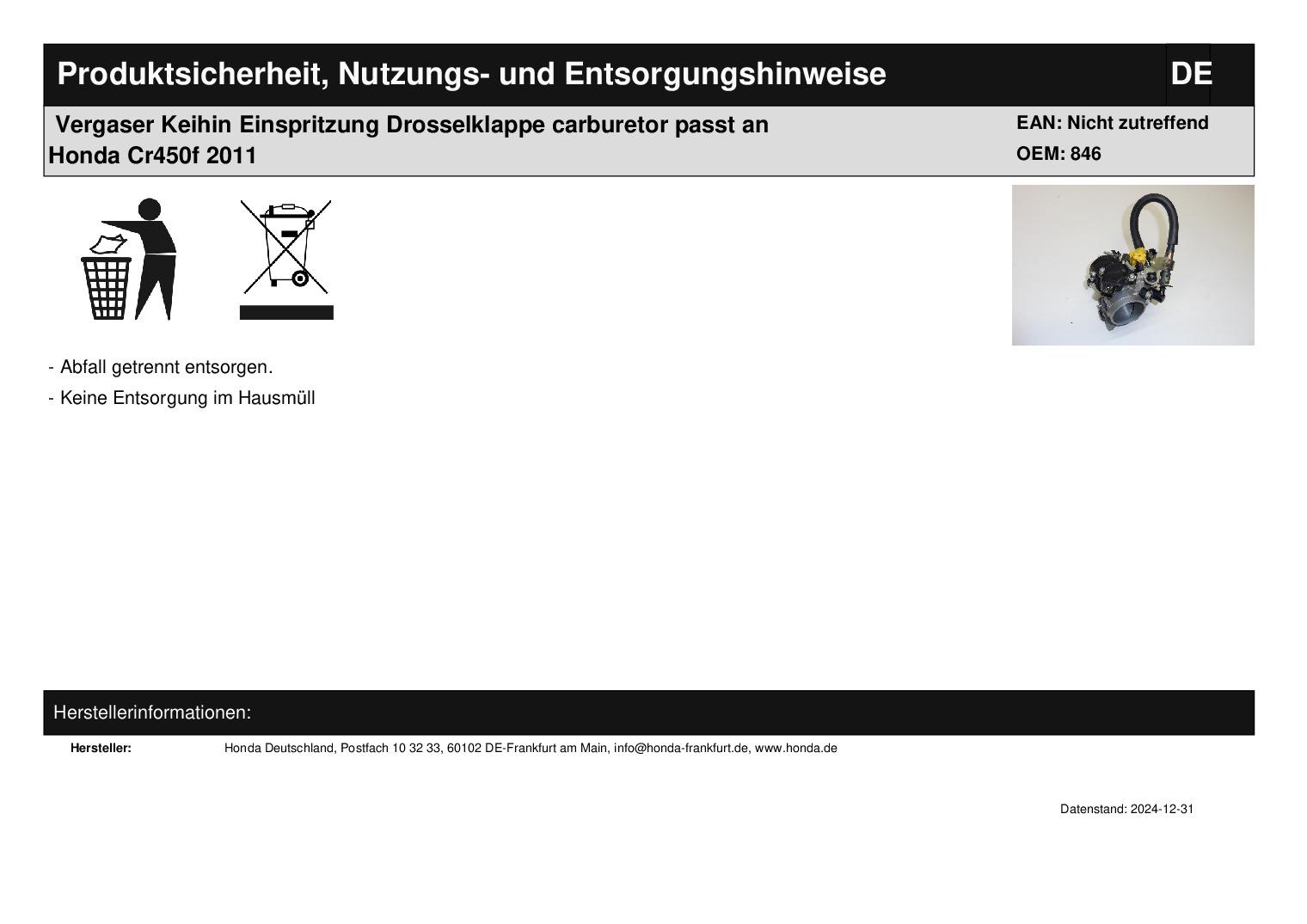 In dieser Auktion gibt es folgenden Artikel zu kaufen: originale Keihin-Einspritzanlage (siehe Foto) Fahrzeug: passend für Honda Crf 450 (4-Takt) Bj.: 2011 (passt evtl. auch für andere Modelle, bitte erst nachfragen!) Lieferumfang: siehe Foto Artikelzustand: normale Gebrauchsspuren vorhanden; Vergaser hat bis zur Demontage problemlos funktioniert; Zustand siehe Foto Bei Unklarheiten oder Fragen bitte erst E-Mail schreiben.