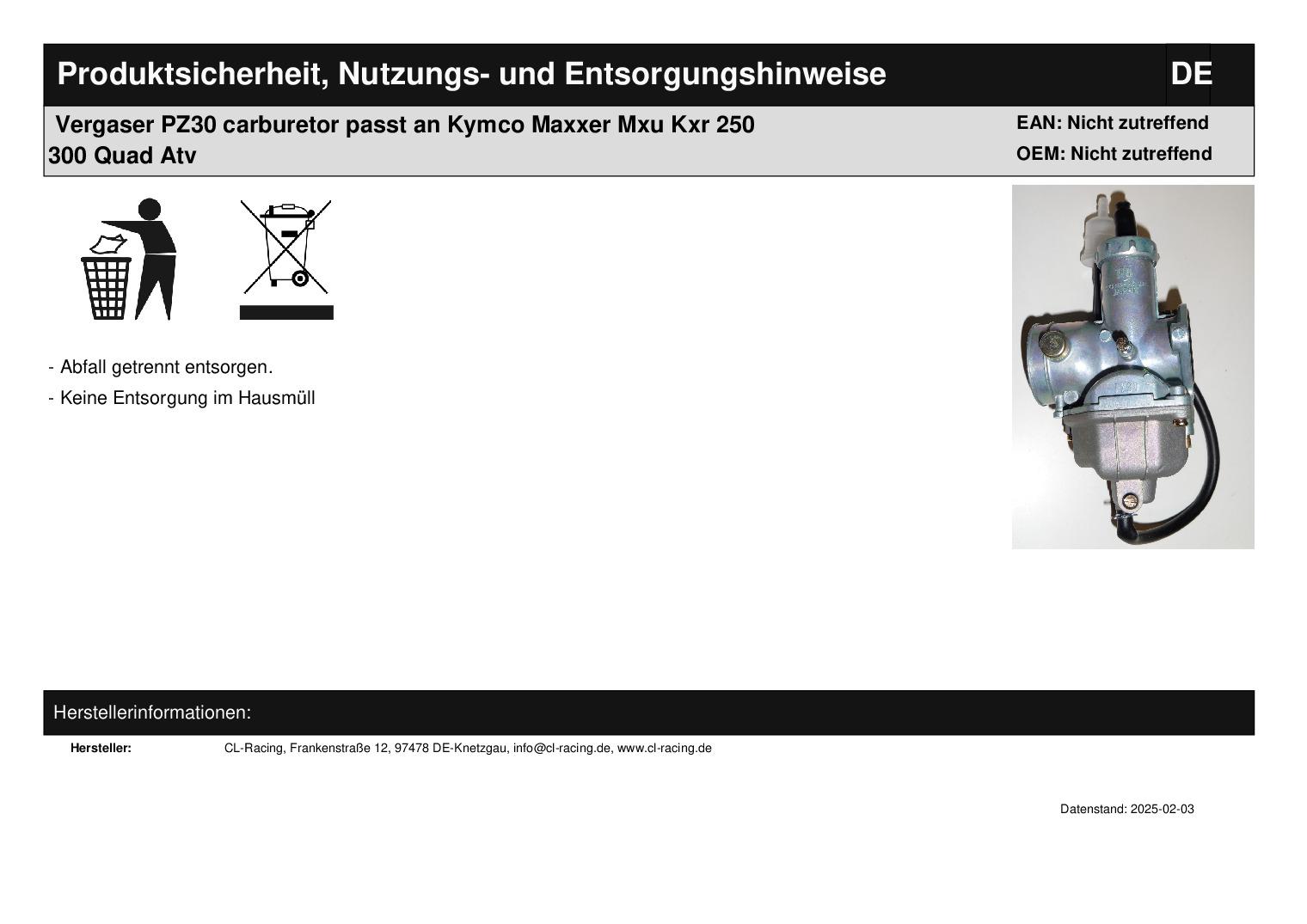 In dieser Auktion gibt es folgenden Artikel zu kaufen: kompletter Nachbau-Vergaser (siehe Foto) Modell: Kymco Maxxer 250, 300 Quad Bj.: unbekannt Abmaße: Bohrungsabstand am Ansaugstutzen: 48 mm (Mitte Bohrung) Durchmesser am Luftfilter: ca. 42 mm Bitte Abmaße vergleichen! Lieferumfang: 1 Stück