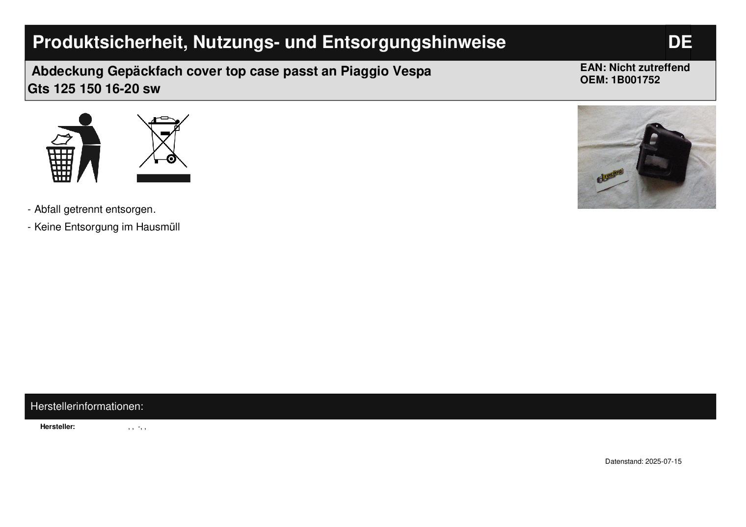 In dieser Auktion gibt es folgenden Artikel zu kaufen: Abdeckung Gepäckfach (siehe Foto) Modell: passend für Piaggio Vespa GTS 125 Bj.: 16 - 20 Vespa GTS 150 Bj.: 16 - 21 Lieferumfang: siehe Foto Artikelzustand: neu aus Geschäftsauflösung, mit leichten Lagerspuren; Zustand siehe Foto Bei Unklarheiten oder Fragen bitte erst E-Mail schreiben.