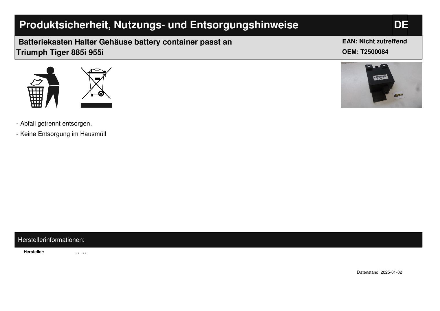 In dieser Auktion gibt es folgenden Artikel zu kaufen: Batteriegehäuse (siehe Foto) Modell: passend für Triumph Tiger 885i Bj.: unbekannt Tiger 955i Bj.: unbekannt Lieferumfang: siehe Foto Artikelzustand: neu aus Geschäftsauflösung, mit minimalen Lagerspuren; Zustand siehe Foto