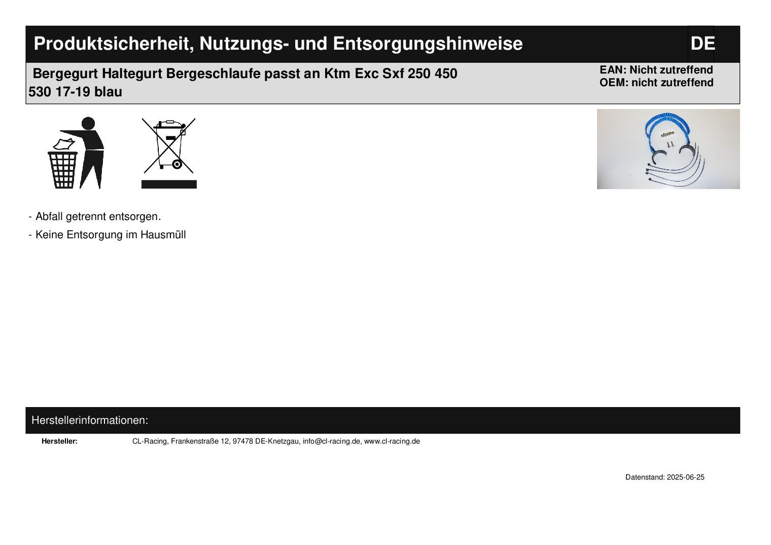 In dieser Auktion gibt es folgenden Artikel zu kaufen: Bergegurt (siehe Foto) Modell: passend für Ktm Sx, Sxf, Exc 125 - 530 Bj.: 2017 - 2019 (2- und 4-Takt) Lieferumfang: Artikelbeschreibung: Bergegurt vorne kann ohne Demontage der Gabelholme montiert werden; Bergegurt hinten wird mit Heckverkleidung am Heck verschraubt; Montage kann in weniger als 15 Minuten erfolgen - Bergegurt vorne: Breite 25 mm, passend für Enduros mit einem Gabelholmdurchmesser von 50 - 70 mm - Bergegurt hinten: Breite 25 mm - 4 x Kabelbinder zur Befestigung der Gurte an den Gabelholmen Artikelzustand: neu Es handelt sich hierbei um kein Originalteil Bei Unklarheiten oder Fragen bitte erst E-Mail schreiben.