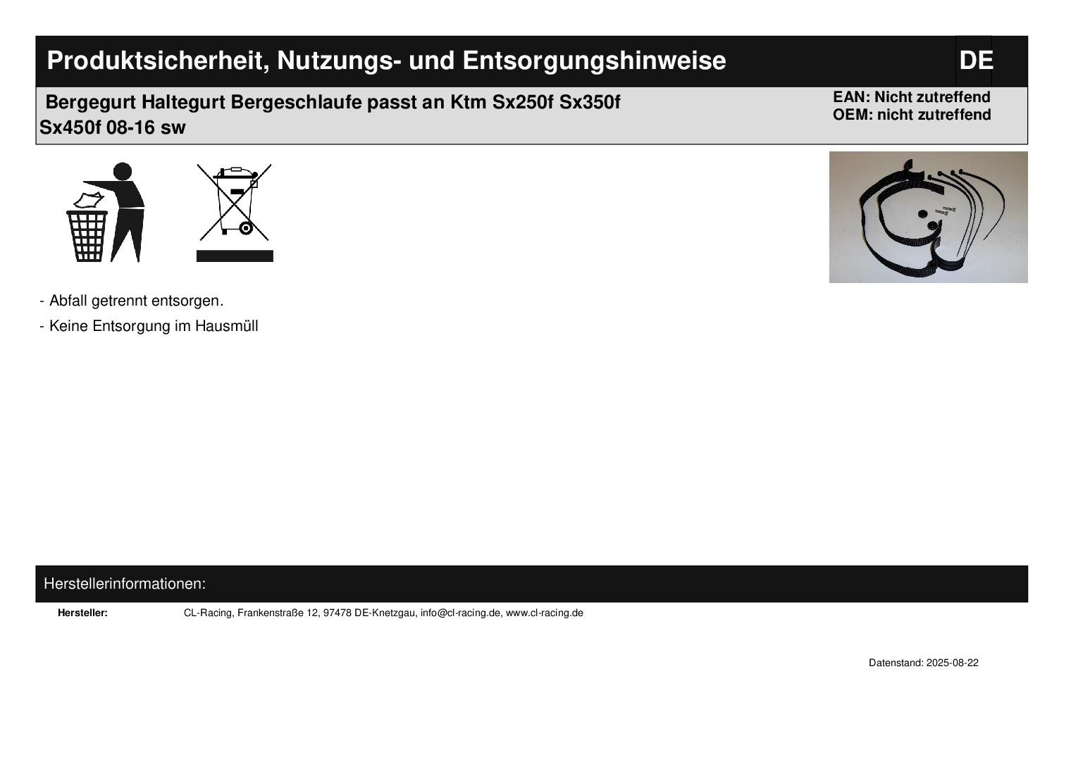 Bergegurt (siehe Foto) Modell: passend für Ktm Sx, Sxf, Exc 125 - 530 Bj.: 2008 - 2016 (2- und 4-Takt) Artikelbeschreibung: Bergegurt vorne kann ohne Demontage der Gabelholme montiert werden; Bergegurt hinten wird mit Heckverkleidung am Heck verschraubt; Montage kann in weniger als 15 Minuten erfolgen Lieferumfang: - Bergegurt vorne: Breite 25 mm, passend für Enduros mit einem Gabelholmdurchmesser von 50 - 70 mm - Bergegurt hinten: Breite 25 mm - 4 x Kabelbinder zur Befestigung der Gurte an den Gabelholmen - 2 x VA-Schraube - 2 x Kunststoffbuchse Artikelzustand: neu Es handelt sich hierbei um kein Originalteil Bei Unklarheiten oder Fragen bitte erst E-Mail schreiben.