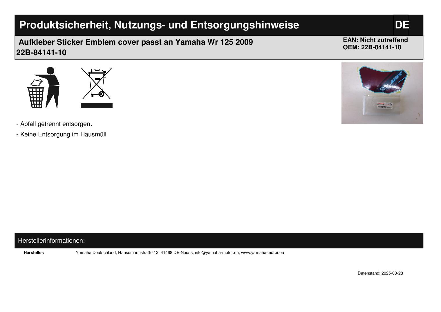WR 125 Bj.: 2009 Lieferumfang: 1 Aufkleber Artikelzustand: neu aus Geschäftsauflösung; Aufkleber liegt schon länger; daher wird dieser als defekt verkauft; Zustand siehe Foto Bei Unklarheiten oder Fragen bitte erst E-Mail schreiben.