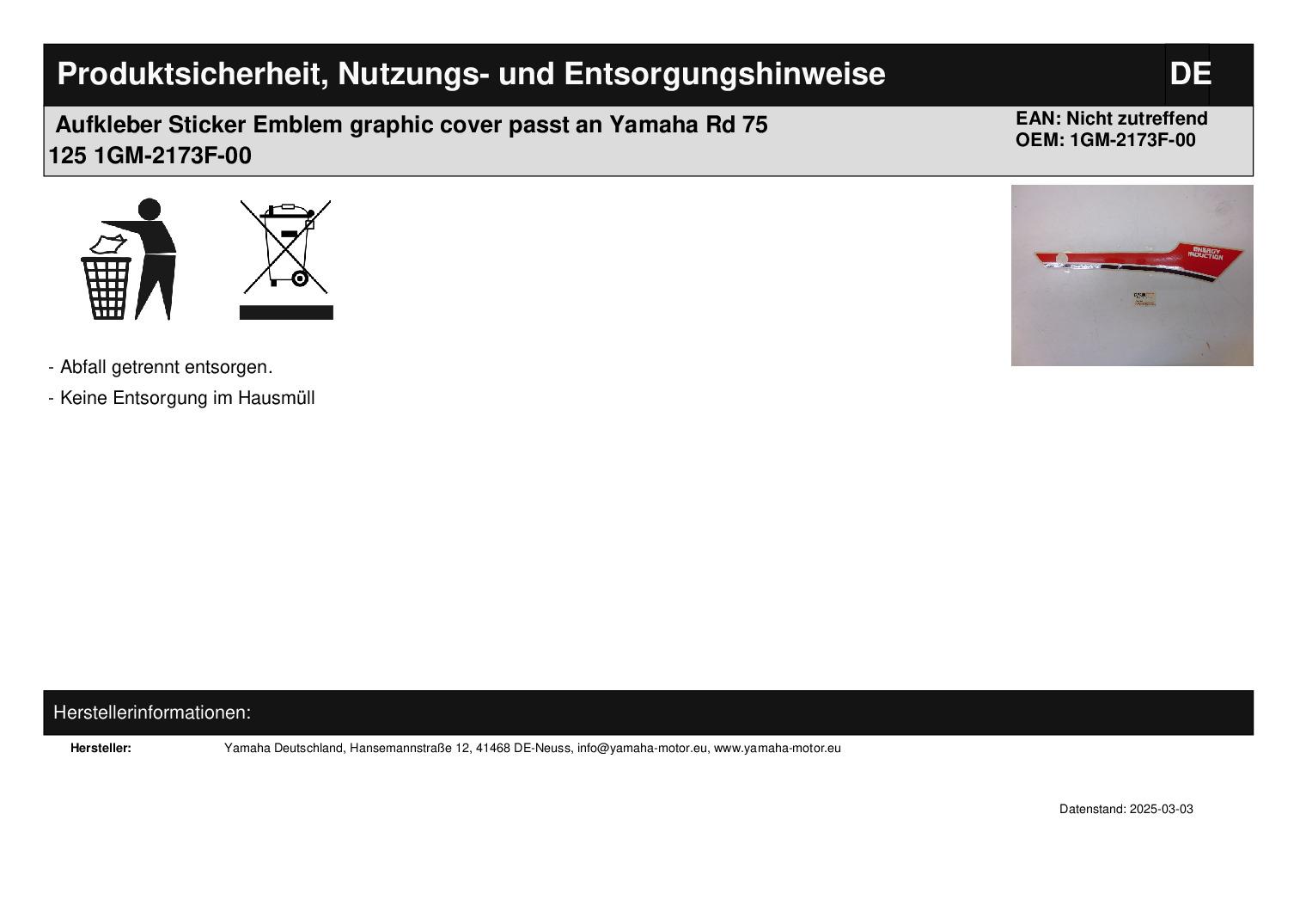 RD 75 Bj.: 91 RD 125 Bj.: 86 Lieferumfang: 1 Aufkleber Artikelzustand: neu aus Geschäftsauflösung; Aufkleber liegt schon länger; daher wird dieser als defekt verkauft; Zustand siehe Foto Bei Unklarheiten oder Fragen bitte erst E-Mail schreiben.