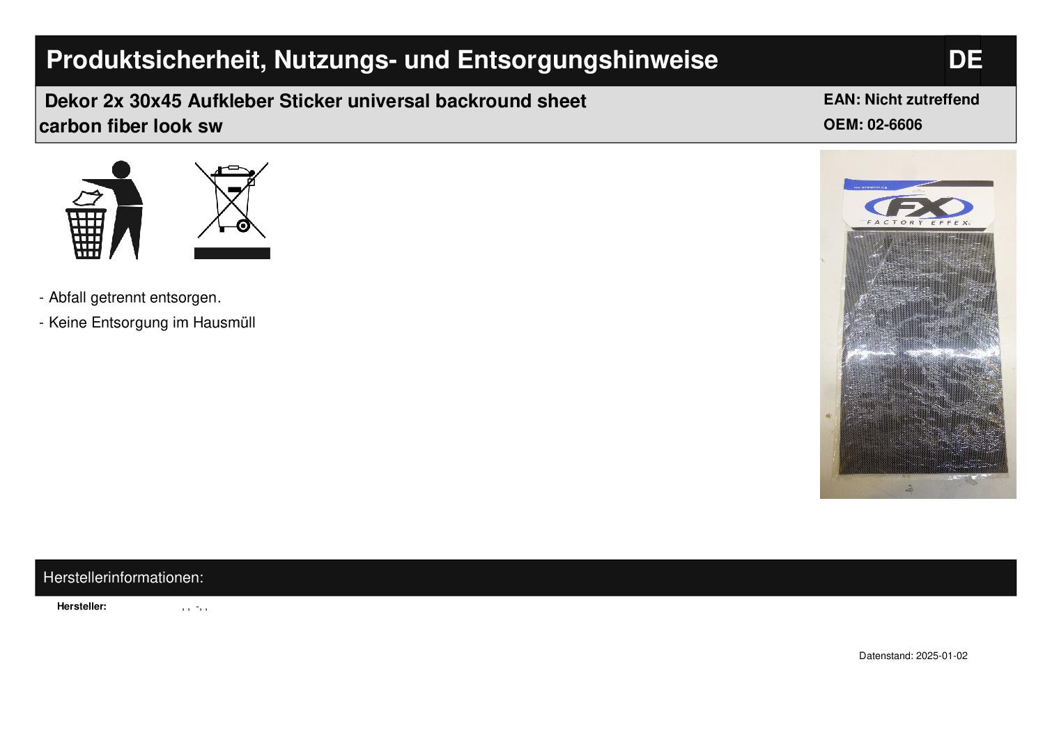 In dieser Auktion gibt es folgenden Artikel zu kaufen: Modell: universal Bj.: unbekannt Details: - echter Kohlefaser-Look - kratzfest - perfekt für Gabeln, Schwingen, Airboxen usw. Abmaße: ca. 30 x 45 cm Lieferumfang: 2 Blatt Artikelzustand: neu aus Geschäftsauflösung, mit minimalen Lagerspuren; Zustand siehe Foto