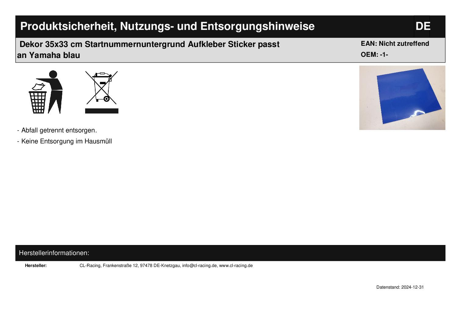 Dekor 35x33 cm Startnummernuntergrund Aufkleber Sticker passt an Yamaha blau