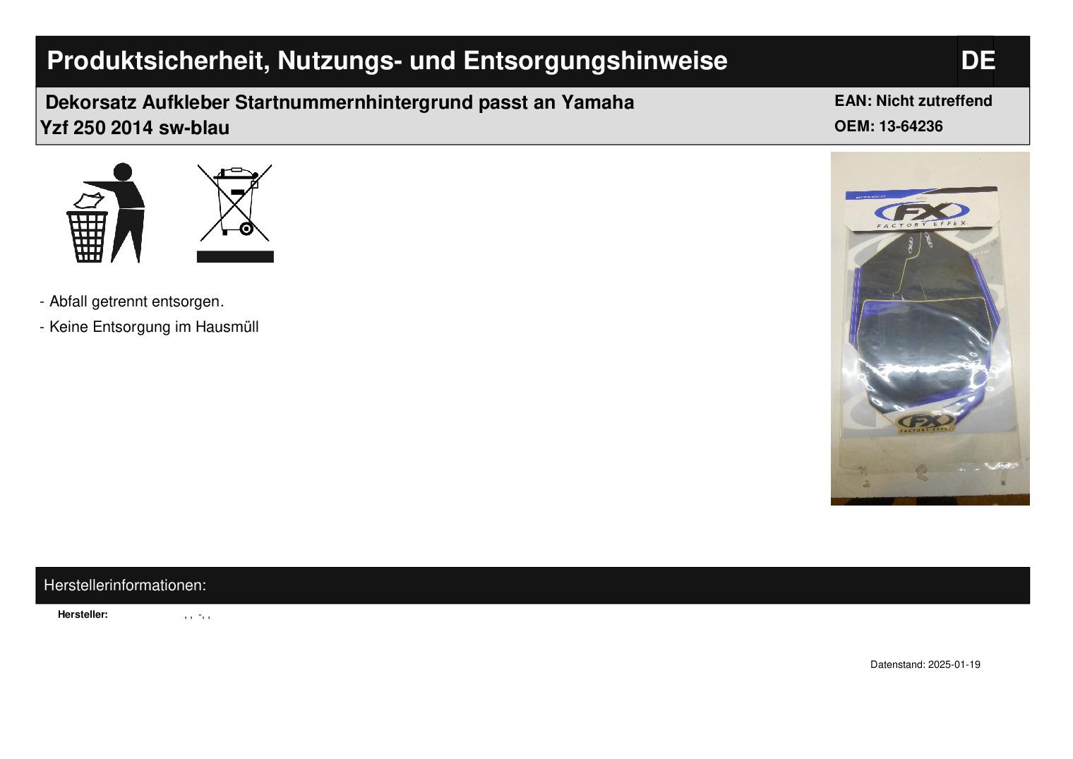 In dieser Auktion gibt es folgenden Artikel zu kaufen: Aufkleber (siehe Foto) Modell: passend für Yamaha YZF 250, 450 Bj.: 2014 Lieferumfang: siehe Foto Artikelzustand: neu aus Geschäftsauflösung, mit minimalen Lagerspuren; Zustand siehe Foto Bei Unklarheiten oder Fragen bitte erst E-Mail schreiben.