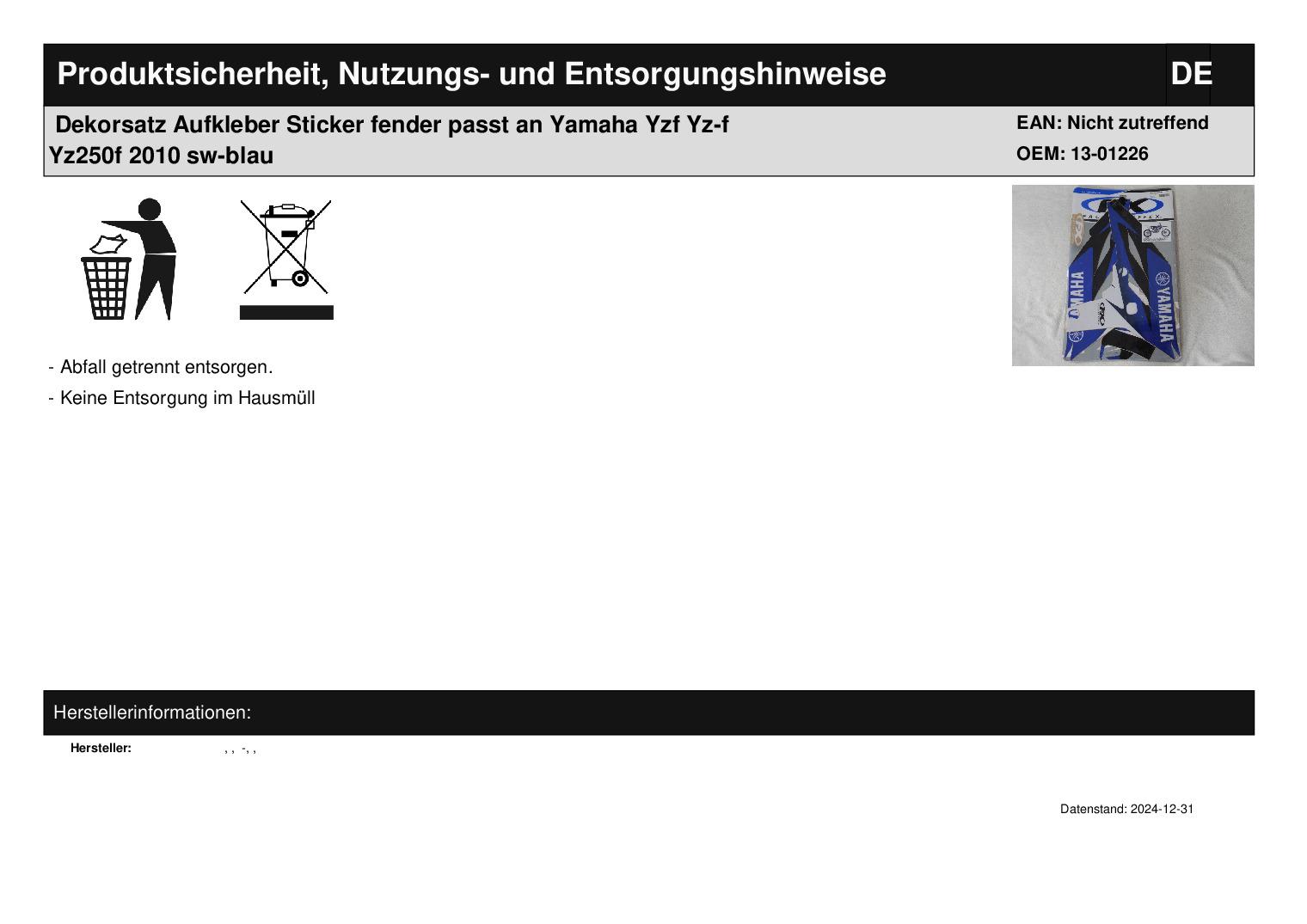 In dieser Auktion gibt es folgenden Artikel zu kaufen: Modell: passend für Yamaha Yzf 250 Bj.: 2010 Lieferumfang: siehe Foto Es werden nur die Aufkleber geliefert, die auf dem Foto zu sehen sind. Artikelzustand: neu aus Geschäftsauflösung, mit minimalen Lagerspuren; Zustand siehe Foto