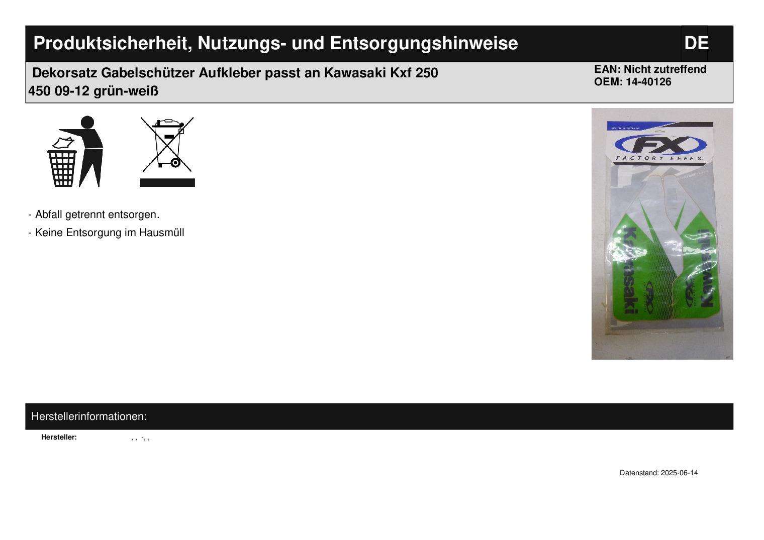 In dieser Auktion gibt es folgenden Artikel zu kaufen: Dekor (siehe Foto) Modell: passend für Kawasaki KXF 250, 450 Bj.: 09 - 12 Lieferumfang: siehe Foto Es werden nur die Aufkleber geliefert, die auf dem Foto zu sehen sind. Artikelzustand: neu aus Geschäftsauflösung, mit minimalen Lagerspuren; Zustand siehe Foto