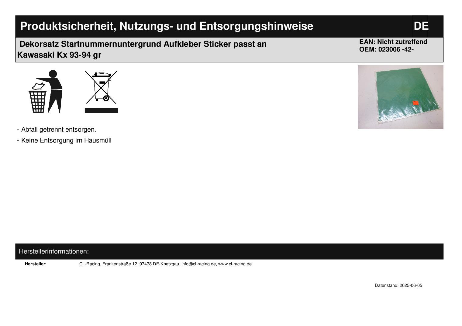 In dieser Auktion gibt es folgenden Artikel zu kaufen: Dekorsatz (siehe Foto) Hersteller: Techno Motor Modell: passend für KTM 125, 250, 500 Bj.: unbekannt passend für Suzuki 125, 250 Bj.: unbekannt passend für Kawasaki 125, 250, 500 Bj.: 93 - 94 passend für Yamaha 125, 250 Bj.: unbekannt passend für Honda 125, 250, 500 Bj.: 94 Lieferumfang: siehe Foto Es werden nur die Aufkleber geliefert, die auf dem Foto zu sehen sind! Artikelzustand: neu aus Geschäftsauflösung; Sticker liegen schon länger; daher werden diese als defekt verkauft; Zustand siehe Foto