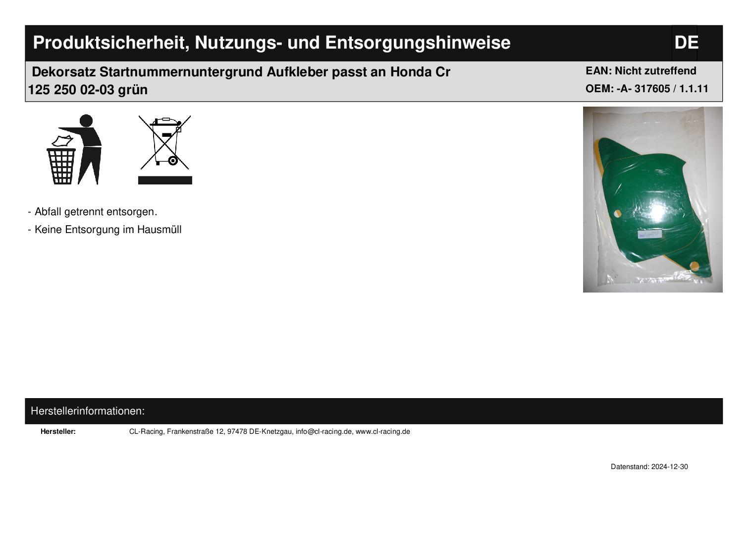 In dieser Auktion gibt es folgenden Artikel zu kaufen: Dekorsatz (siehe Foto) Modell: passend für Honda CR 125, 250 Bj.: 02 - 03 Lieferumfang: siehe Foto Es werden nur die Aufkleber geliefert, die auf dem Foto zu sehen sind. Artikelzustand: neu aus Geschäftsauflösung; Sticker liegen schon länger; daher werden diese als defekt verkauft; Zustand siehe Foto Bei Unklarheiten oder Fragen bitte erst E-Mail schreiben.