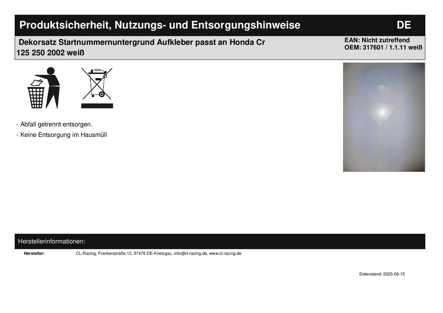 In dieser Auktion gibt es folgenden Artikel zu kaufen: Dekorsatz (siehe Foto) Modell: passend für Honda CR 125, 250 Bj.: 02 Lieferumfang: siehe Foto Es werden nur die Aufkleber geliefert, die auf dem Foto zu sehen sind. Artikelzustand: neu aus Geschäftsauflösung; Sticker liegen schon länger; daher werden diese als defekt verkauft; Zustand siehe Foto Bei Unklarheiten oder Fragen bitte erst E-Mail schreiben.