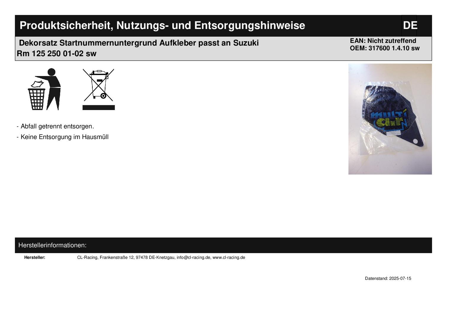 In dieser Auktion gibt es folgenden Artikel zu kaufen: Dekorsatz (siehe Foto) Modell: passend für Suzuki RM 125, 250 Bj.: 01 - 02 Lieferumfang: siehe Foto Es werden nur die Aufkleber geliefert, die auf dem Foto zu sehen sind! Artikelzustand: neu aus Geschäftsauflösung; Sticker liegen schon länger; daher werden diese als defekt verkauft; Zustand siehe Foto