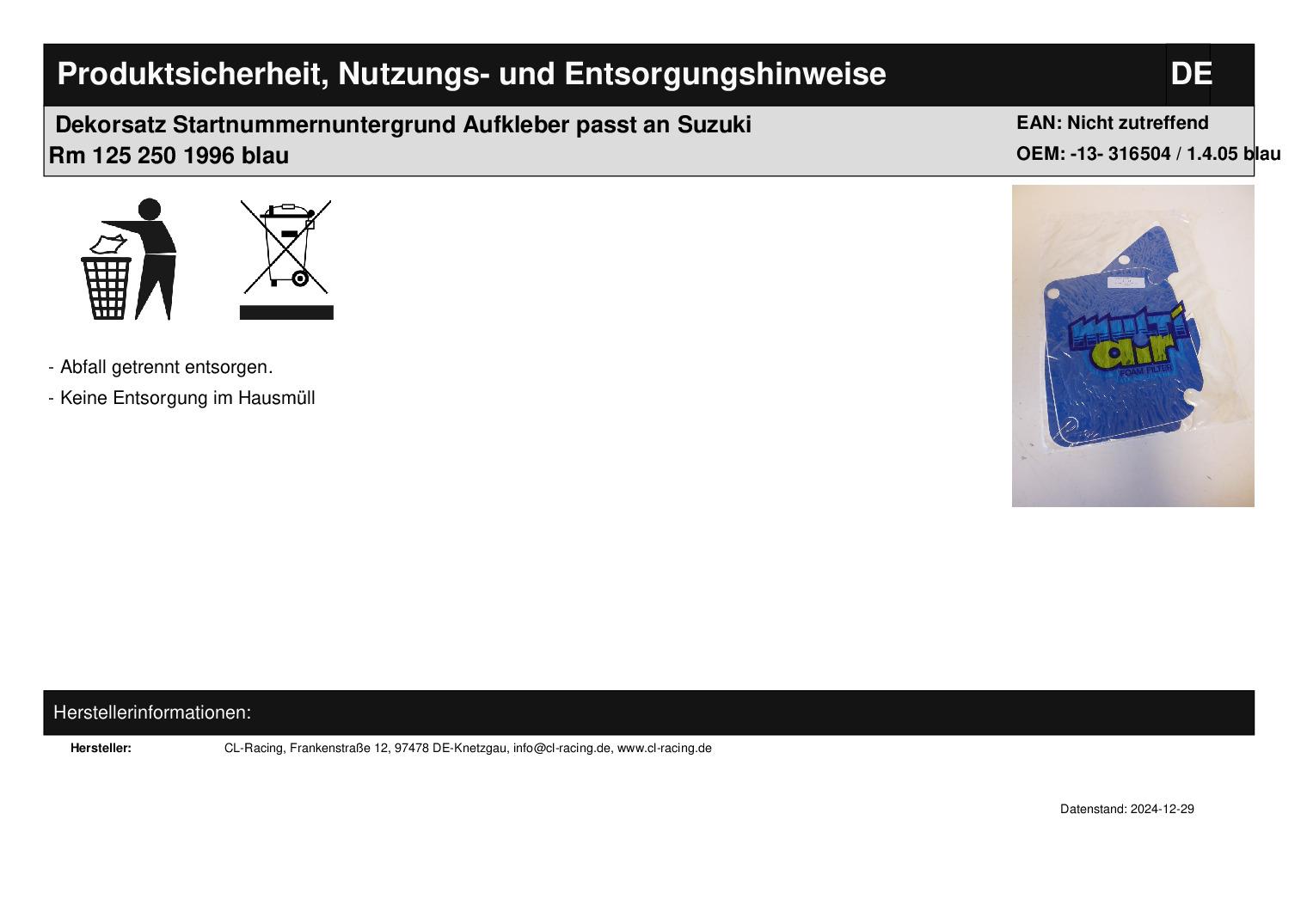 In dieser Auktion gibt es folgenden Artikel zu kaufen: Dekorsatz (siehe Foto) Hersteller: MultiAir Modell: passend für Suzuki RM 125, 250 Bj.: 96 Lieferumfang: siehe Foto Es werden nur die Aufkleber geliefert, die auf dem Foto zu sehen sind! Artikelzustand: neu aus Geschäftsauflösung; Sticker liegen schon länger; daher werden diese als defekt verkauft; Zustand siehe Foto