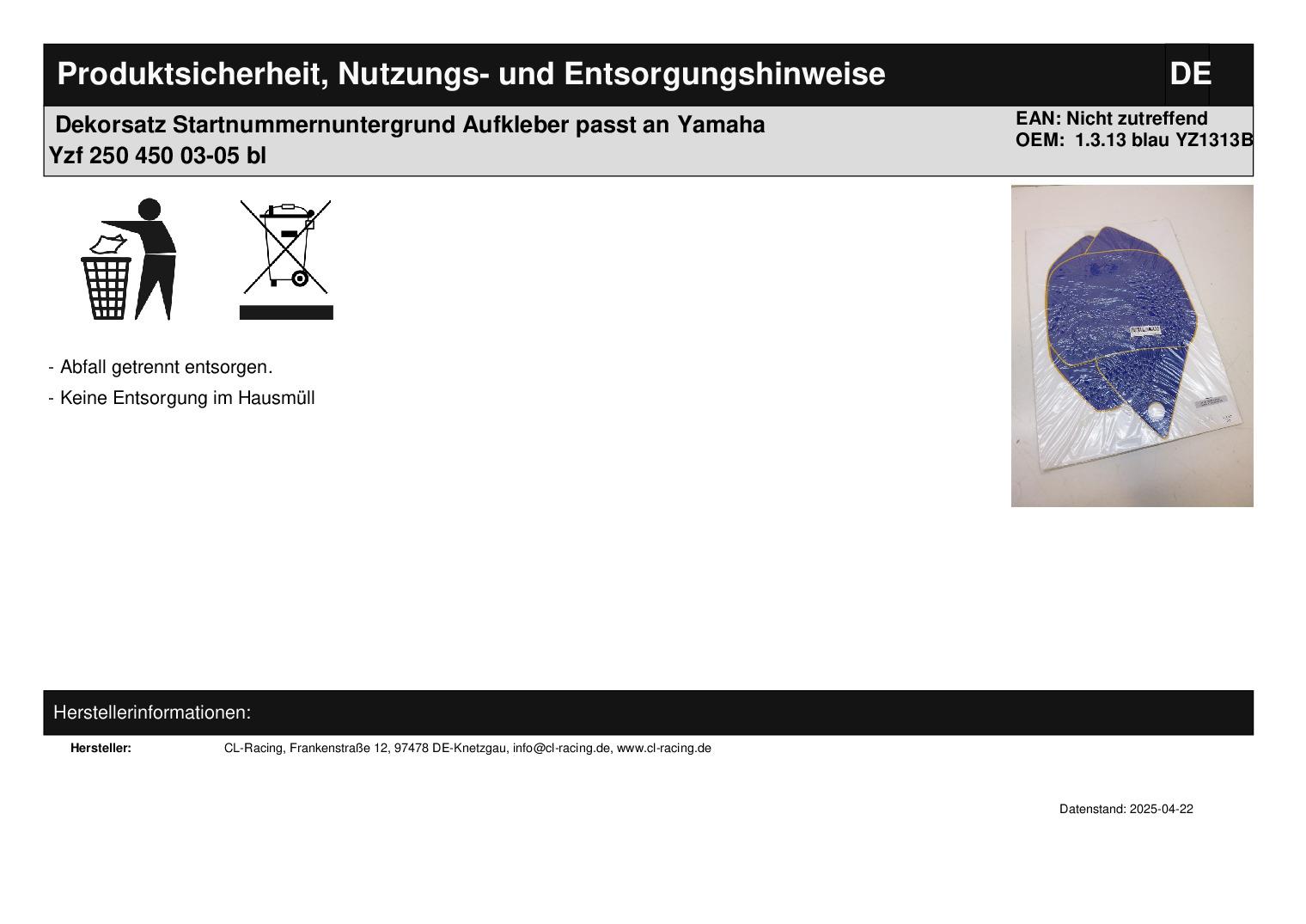 Titel: Dekorsatz Startnummernuntergrund Aufkleber passt an Yamaha Yzf 250 450 03-05 bl