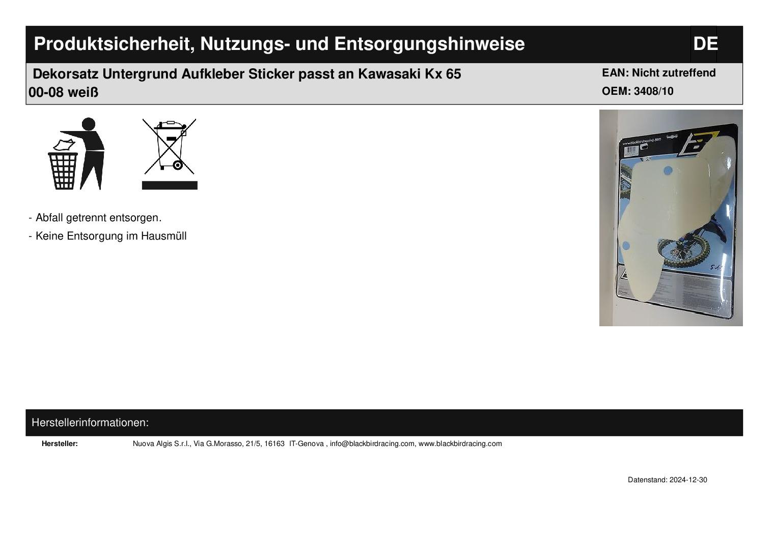 In dieser Auktion gibt es folgenden Artikel zu kaufen: Dekor Blackbird Racing (siehe Foto) Modell: passend für Kawasaki KX 65 Bj.: 00 - 08 Lieferumfang: siehe Foto Artikelzustand: neu aus Geschäftsauflösung, mit minimalen Lagerspuren; Zustand siehe Foto